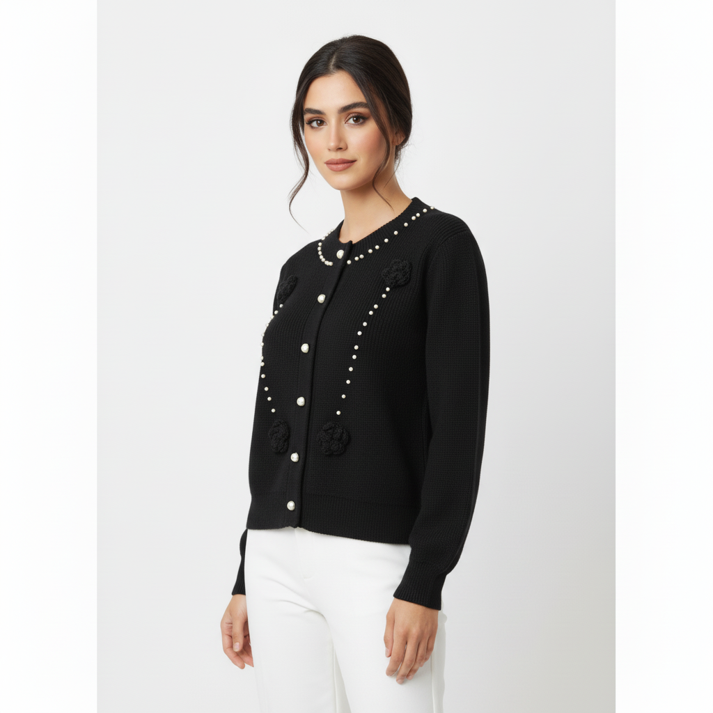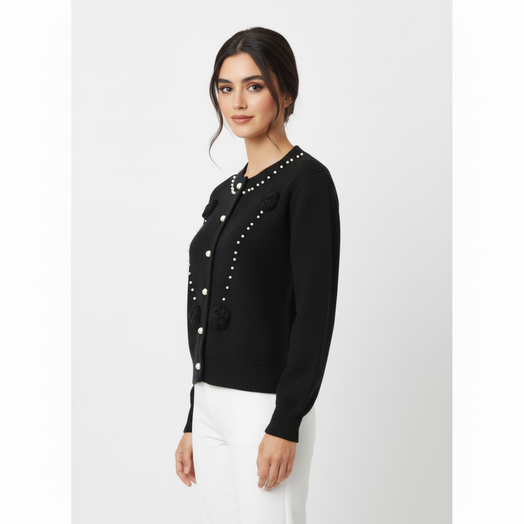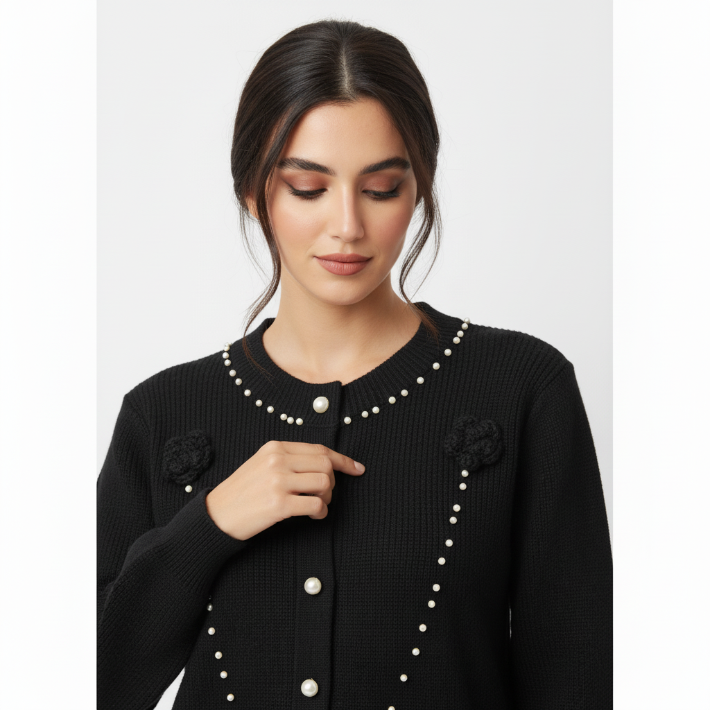 Refined, radiant, and ready to turn heads—this black knit cardigan is a statement piece that blends classic charm with modern detailing. Whether you're layering for a crisp evening or elevating your everyday look, this cardigan delivers effortless sophistication. ✨ Key Features: • Soft Knit Fabric: Comfortable and breathable with a gentle stretch for all-day wear. • Pearl Button Front: Adds a luxe, vintage-inspired touch. • Vertical Beadwork: Twin lines of pearl-like beads elongate the silhouette and add subtle shimmer. • Floral Embellishments: Three delicate floral appliqués on each side bring a romantic flair. • Curved Beaded Neckline: Frames the face with a graceful arc of pearls. • Ribbed Edges: Cuffs and hem offer structure and a polished finish. • 🎯 Style It Your Way: Pair with tailored trousers for a chic office look or layer over a satin slip dress for evening elegance. • 📏 Fit & Sizing: Relaxed fit. True to size. Model is 5'6" and wears size S. Check our size guide for the perfect fit.