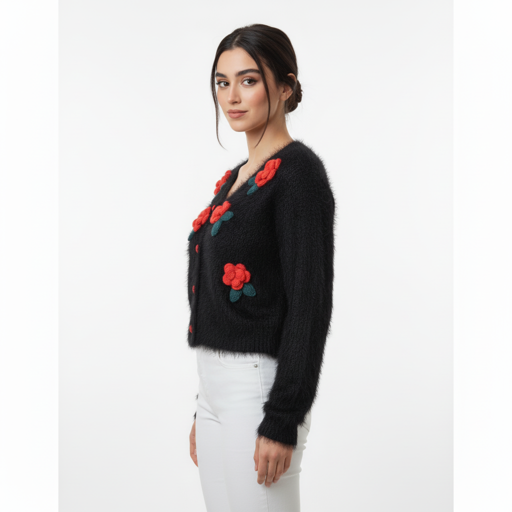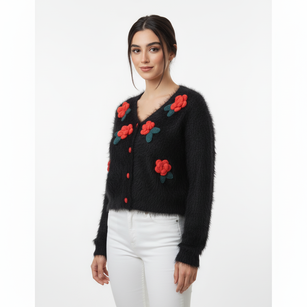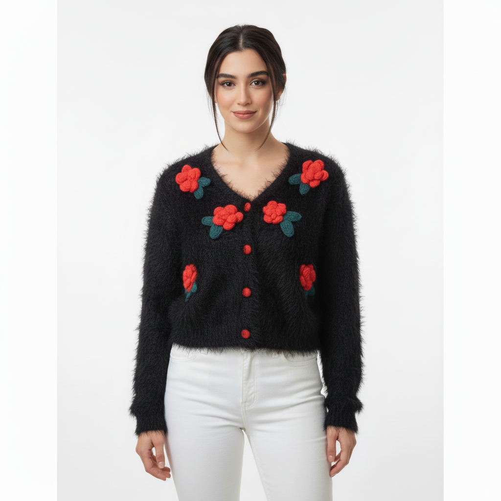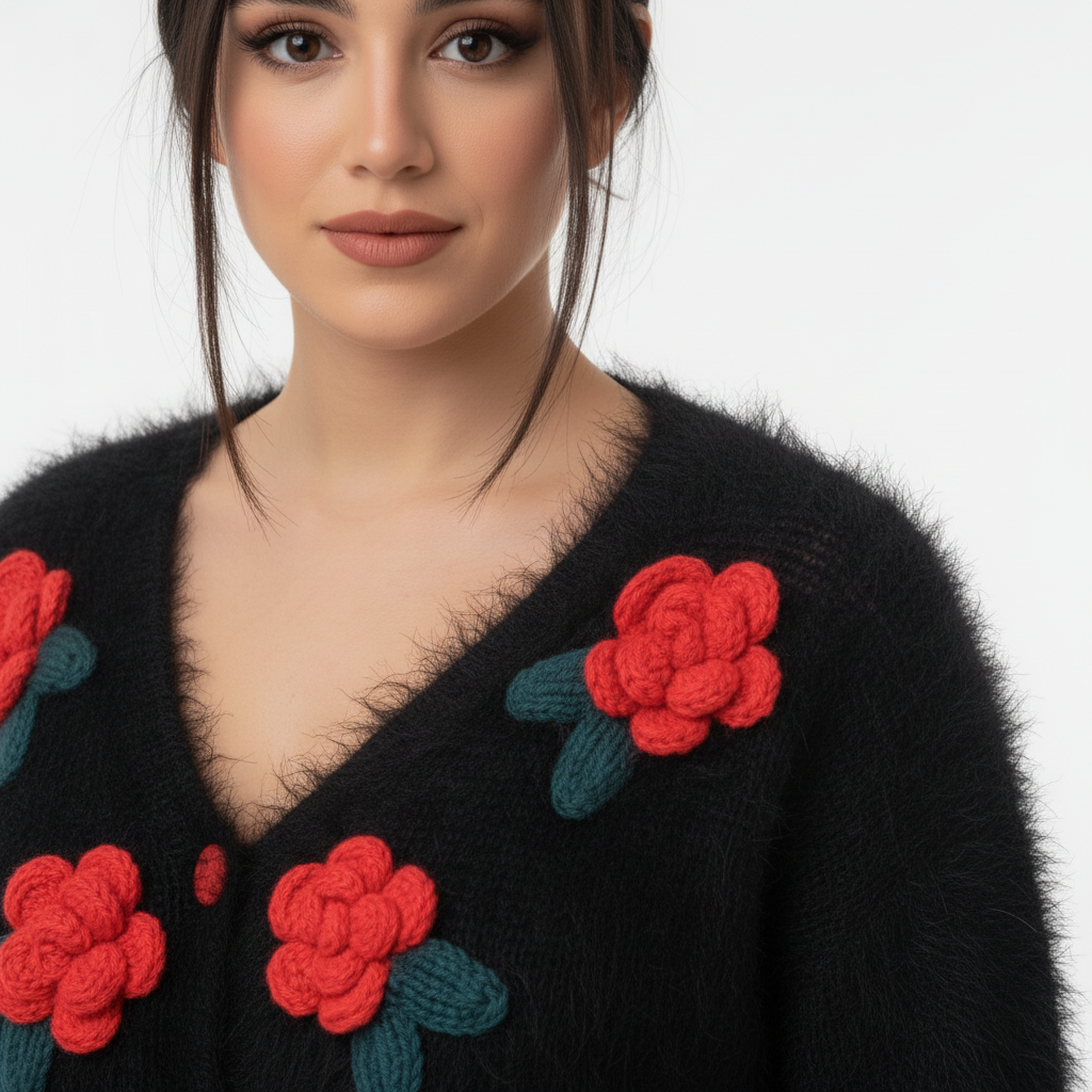 Soft rebellion. Floral precision. Cozy with a twist. The ZAKH Bloomcore Fuzzy Knit Sweater brings together plush texture and handcrafted detail. With its jet-black base and vibrant red floral appliqués, this piece is a tactile statement—perfect for layering or standing alone. 🔍 Key Features • Colorway: Noir Black base with Rouge Red flowers and Forest Green leaves • Material: Ultra-soft faux fur knit for warmth and comfort • Closure: Three red center buttons for easy wear and visual contrast • Design Details: o Six hand-crocheted flower appliqués arranged symmetrically o Fluffy finish for a cozy, elevated feel • Fit: Relaxed silhouette with drop shoulders and soft drape