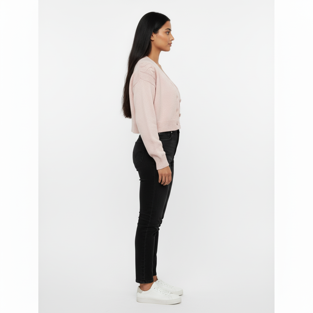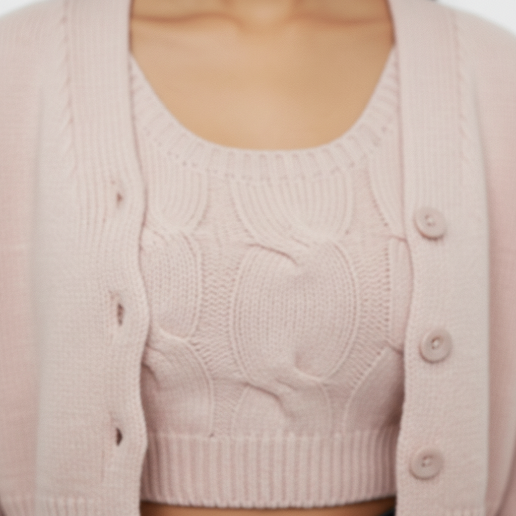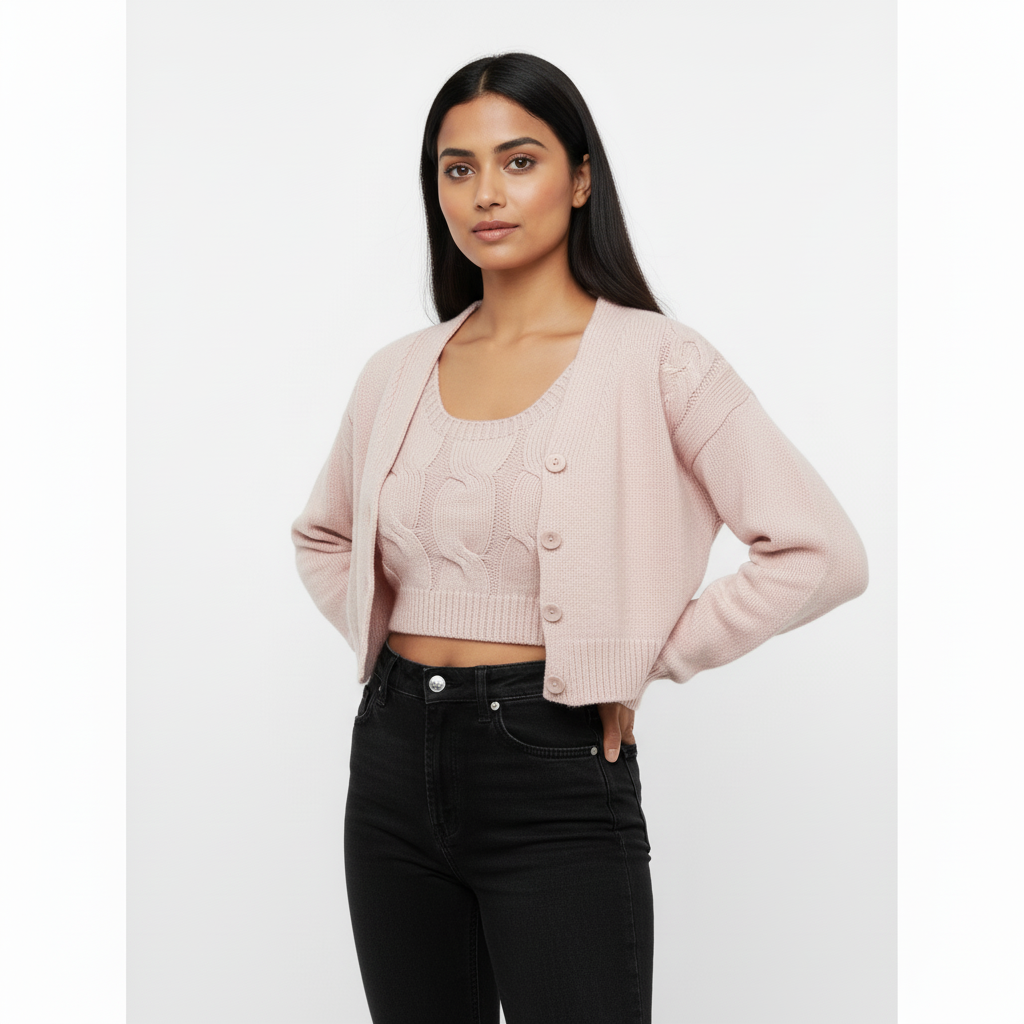 Soft, sweet, and effortlessly chic — this blush-toned knitwear duo is perfect for layering or standalone styling. The ribbed crop top offers a snug, flattering fit, while the matching cardigan adds dimension with pearl-style buttons and a cozy silhouette. Ideal for transitional weather, boutique styling, or casual elegance. ✨ Features: • Two-piece set: ribbed knit crop top + buttoned cardigan • Soft blush pink hue for a romantic vibe • White pearl-style buttons with ribbed placket and cuffs • Cozy knit texture with gentle stretch • Perfect for layering, styling with skirts, or pairing with denim 📏 Fit & Fabric: • Slim-fit crop top with stretch • Cardigan: relaxed fit with button front • Fabric: Polyester blend knit • Model is 5'6" and wears size S