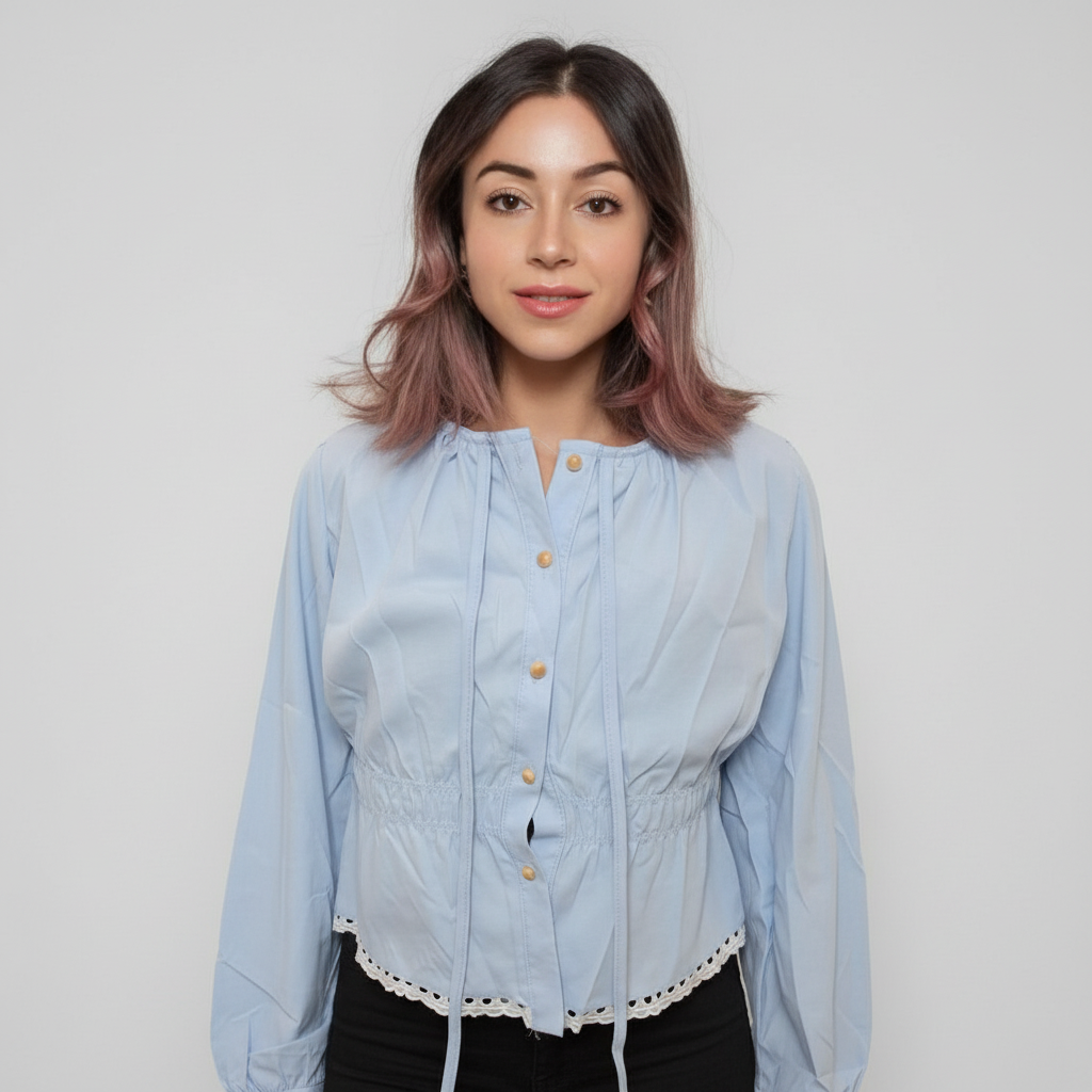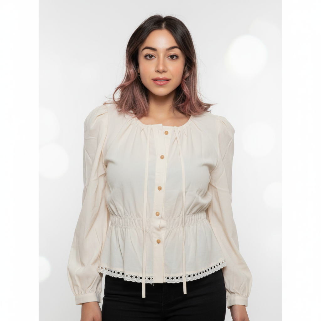 Earthy, elegant, and quietly expressive—the RustVale Lace-Tie Blouse blends vintage softness with subtle drama. Featuring puffed sleeves, a gathered waist, and delicate lace trim, it’s a piece that moves with warmth and character. Ideal for transitional seasons, creative workspaces, or slow-paced city days. Overview: • A long-sleeved blouse with lace-trimmed hem, gold button accents, and tie neckline for a romantic, heritage-inspired look. • Fabric/Material: • Outer: Lightweight cotton blend with soft gathers and eyelet lace trim • Lining: Unlined for breathable wear • Design Details: • Top: Round neckline with partial button placket, long fabric ties, gathered pleats at shoulders • Back: Elasticized waist with soft flare, lace-trimmed hemline • Colour: Cocoa Brown with White Lace & Gold Button Accents • Available Sizes: FREE SIZE S to XL • Fit: Relaxed fit with cinched waist; true to size • Care Instructions: Gentle cold wash or dry clean; steam lightly; do not bleach • Closure Type: Button-down front with pullover styling • Occasion: Daywear, Studio Time, Transitional Weather, Cultural Outings • Additional Information: • Stretch level: Moderate at waist • Lining: None