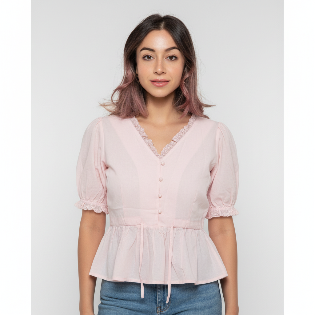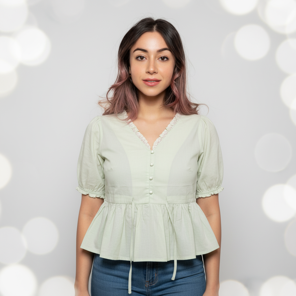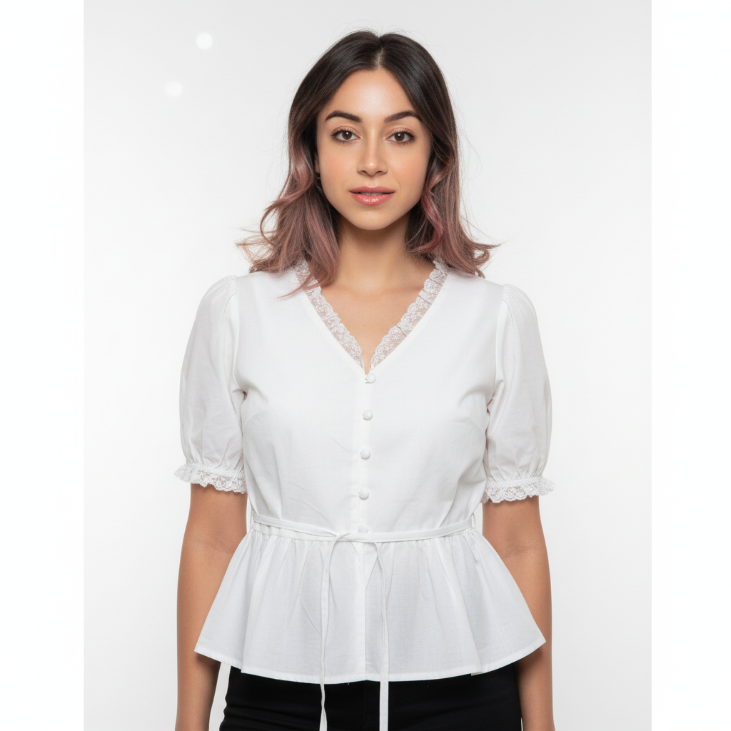 Refined, romantic, and timeless—the BelleEra Peplum Blouse channels vintage elegance with modern ease. Featuring lace-trimmed puff sleeves, a cinched waist, and delicate button detailing, it’s a piece that flatters with grace and nostalgia. Perfect for heritage-inspired styling, cultural outings, or slow Sundays in the city. • Overview: A semi-sheer blouse with lace-trimmed sleeves, button-down front, and peplum waist for a tailored vintage silhouette. • Fabric/Material: • Outer: Lightweight cotton blend with soft structure and lace accents • Lining: Unlined for breathable wear • Design Details: • Top: V-neckline with lace trim, short puffed sleeves with lace cuffs, vertical seams for shaping • Back: Gathered peplum with tie-front belt for adjustable fit • Colour: Cream with White Lace & Button Accents • Available Sizes: FREE SIZE S to L • Fit: Fitted bodice with adjustable waist tie; true to size • Care Instructions: Gentle cold wash or dry clean; steam lightly; do not bleach • Closure Type: Front button closure with tie belt • Occasion: Cultural Events, Daywear, Vintage-Inspired Styling, Brunch • Additional Information: • Stretch level: None • Lining: None