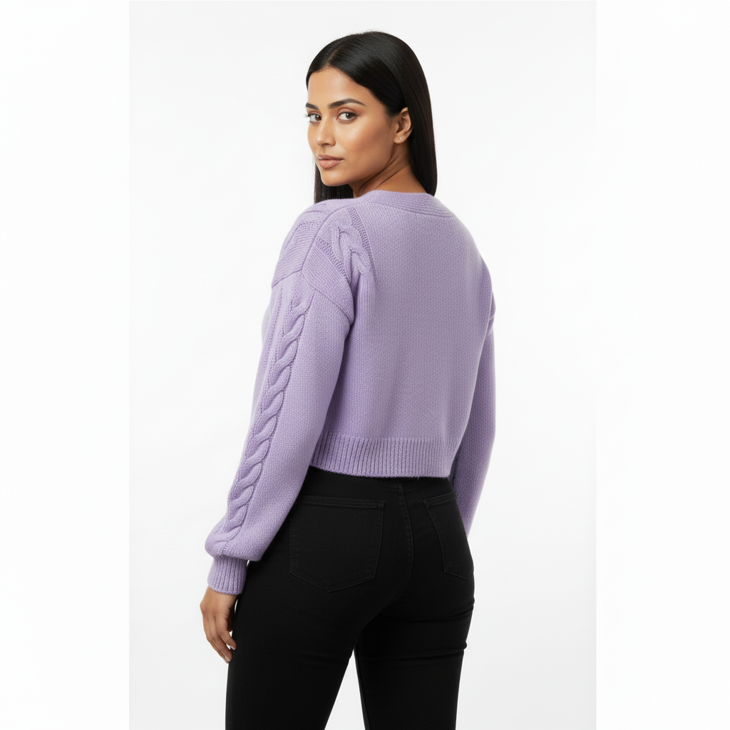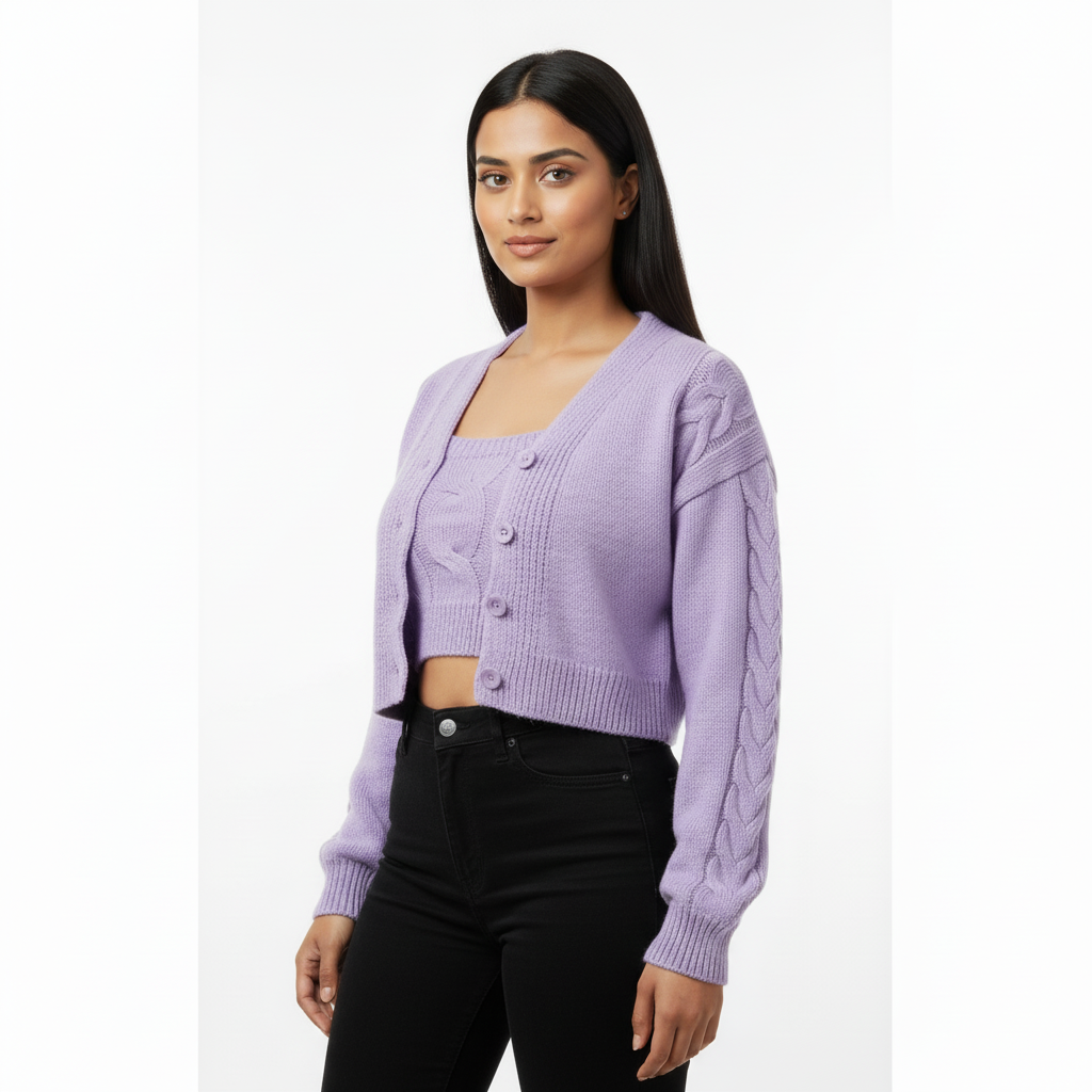 ✨ Product Description Soft, structured, and effortlessly cool — the Dusty Lilac Knit Co-Ord is a two-piece layering essential that blends cozy texture with streetwear edge. Featuring a cropped button-down cardigan and a matching cable-knit tank, this set is designed for transitional weather and elevated casual looks. The cardigan’s ribbed cuffs and button band offer clean structure, while the tank’s central cable knit adds visual depth. Wear them together for a tonal statement or style them separately to mix textures across your wardrobe. 📌 Key Features • Two-piece set: Cropped cardigan + cable-knit tank • Material: Soft acrylic blend with gentle stretch • Design: Ribbed edges, cable-knit center, tonal button closure • Colour: Dusty lilac / pastel purple • Fit: Slim cropped silhouette • Style tip: Pair with cargo pants or pleated skirts for a dreamy streetwear twist 📏 Size & Fit Model is 5'6" and wears size M.