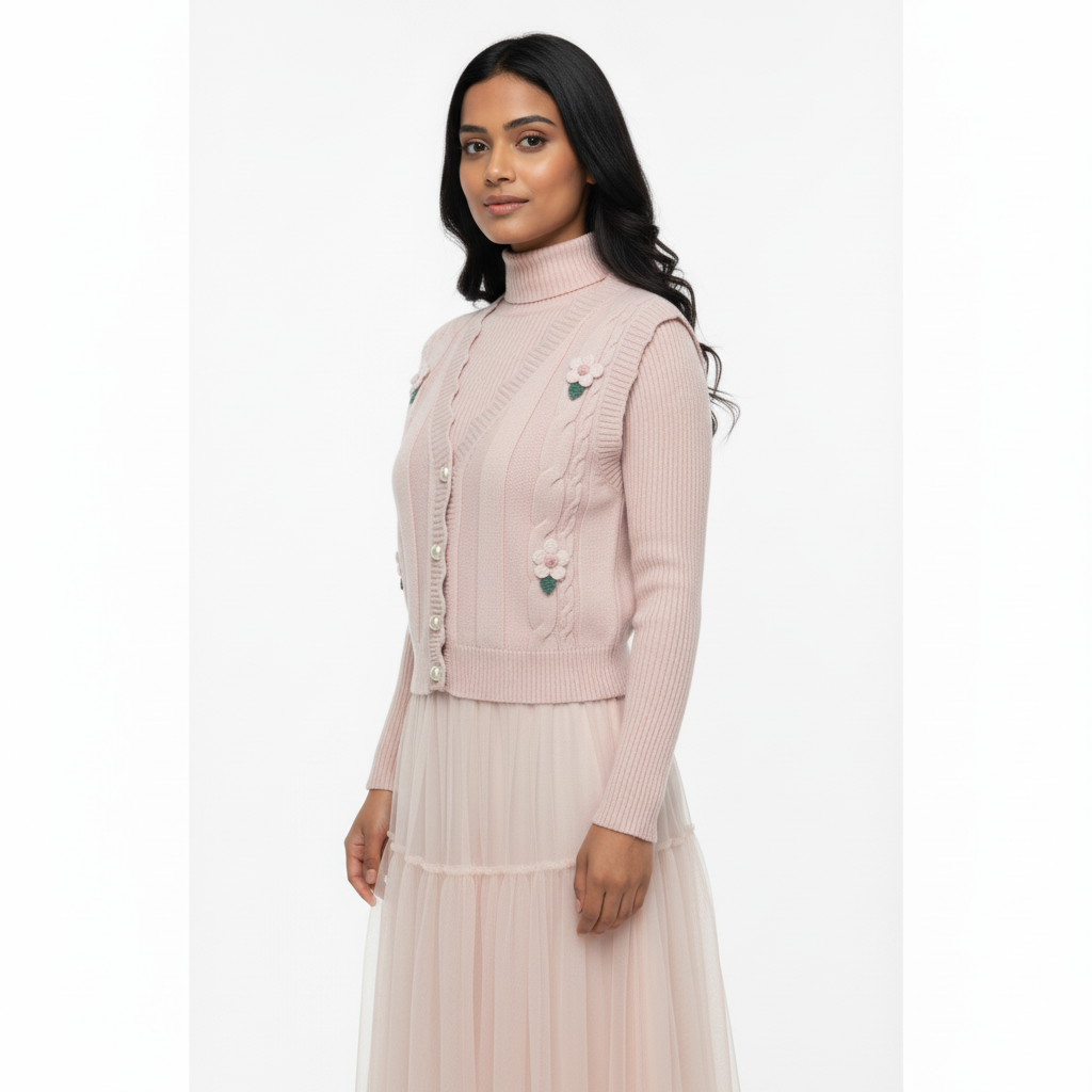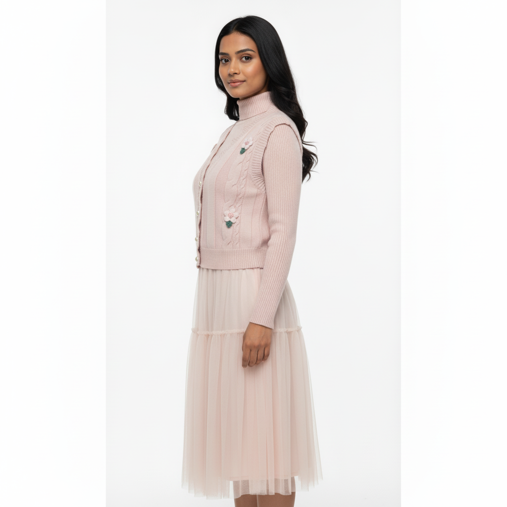 Step into softness with this blush-toned two-piece set that blends cozy knitwear with airy elegance. The ribbed turtleneck top features delicate floral embroidery and pearl-style buttons, while the layered tulle skirt adds graceful movement and a dreamy silhouette. Perfect for boutique styling, semi-formal occasions, or soft editorial looks. ✨ Features: • Coordinated set: embroidered knit top + layered tulle skirt • Ribbed long-sleeve top with pearl button front • Pink floral embroidery with green leaf detailing • Horizontal seam detail on skirt for added structure • Soft blush colour for a romantic, feminine vibe 📏 Fit & Fabric: • Slim-fit top with stretch • Skirt: layered tulle with elastic waistband • Fabric: Polyester blend (top), nylon tulle (skirt) • Model is 5'6" and wears size S