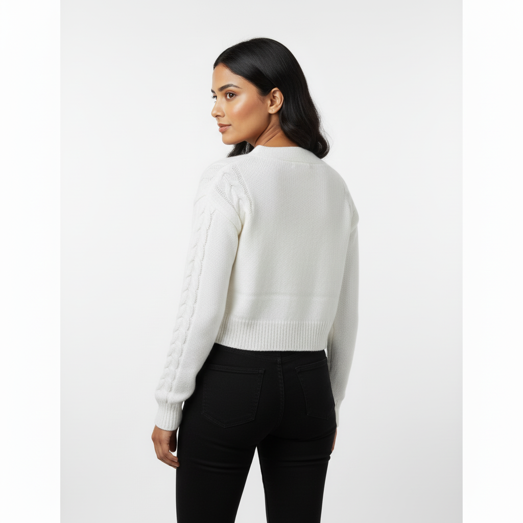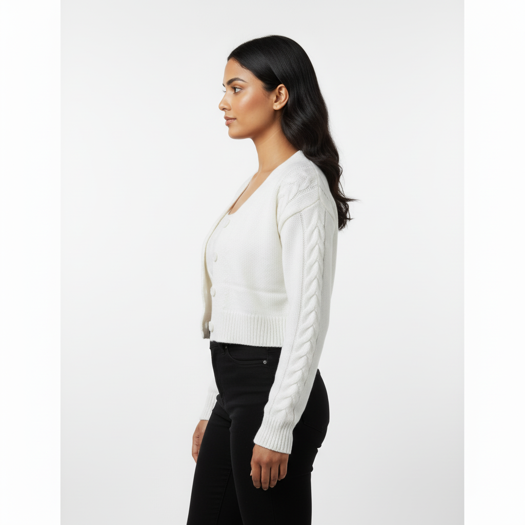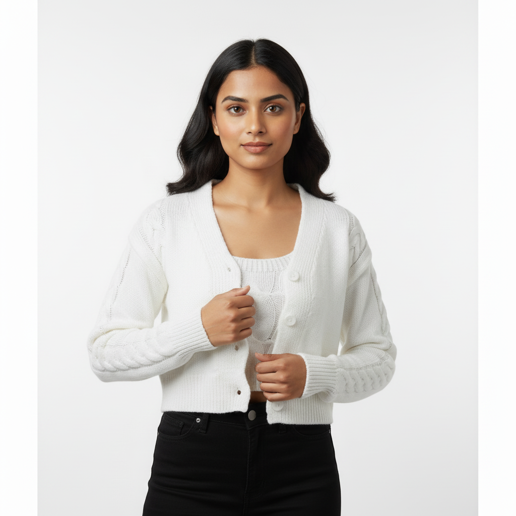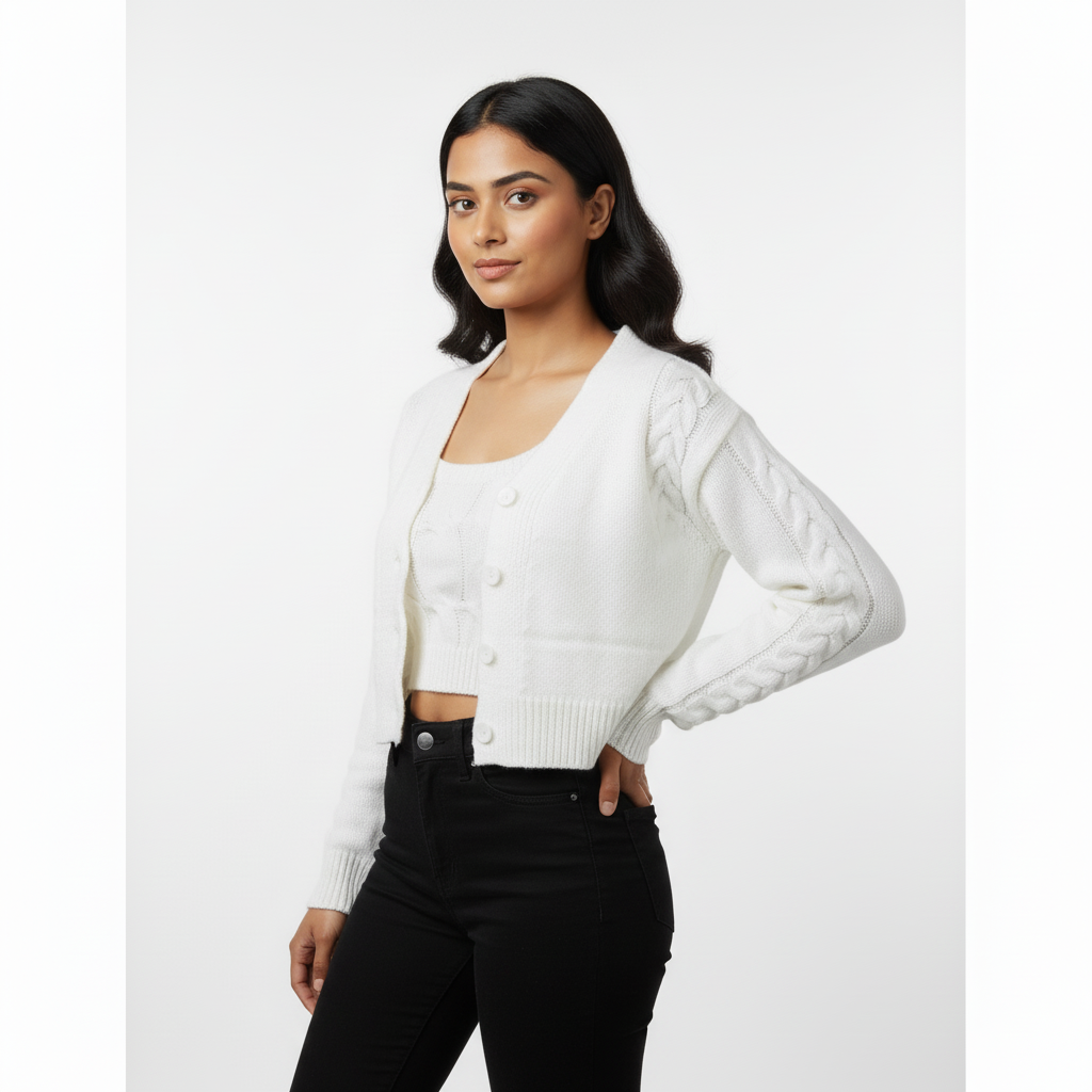 ✨ Product Description Soft, structured, and effortlessly chic — the Ivory Knit Co-Ord is your go-to layering set for cooler days. This two-piece includes a cropped button-down cardigan and a matching cable-knit tank, both crafted from plush yarn with subtle stretch for comfort and shape retention. The cardigan features delicate eyelet detailing near the hem and a clean ribbed neckline, while the tank adds texture with vertical cable patterns. Whether styled together or worn solo, this set brings a refined edge to your winter wardrobe. 📌 Key Features • Two-piece set: Cropped cardigan + cable-knit tank • Material: Premium acrylic blend with soft stretch • Design: Eyelet accents, ribbed trims, and vertical cable detailing • Closure: 5-button front on cardigan • Colour: Classic ivory white • Style tip: Pair with tonal trousers or denim for a monochrome moment 📏 Size & Fit Model is 5'6" and wears size S.