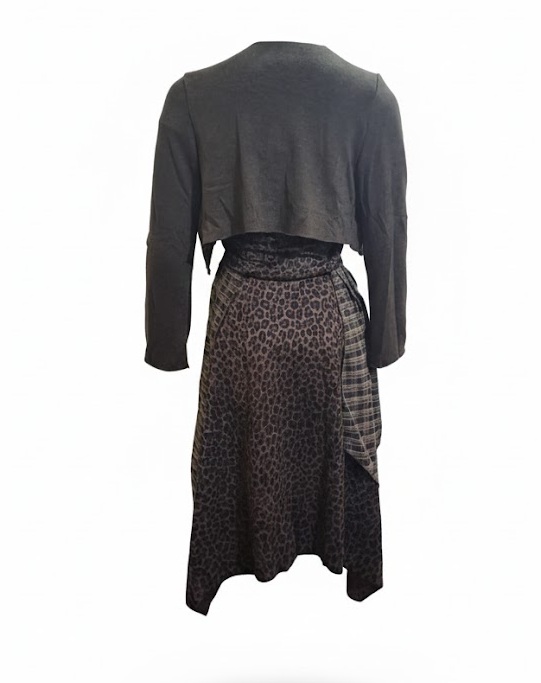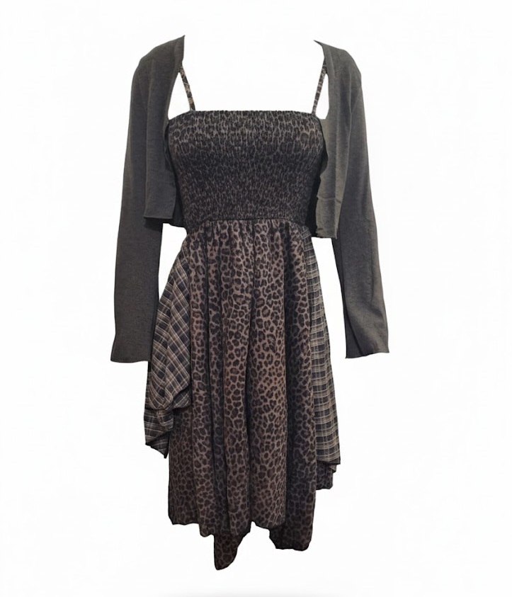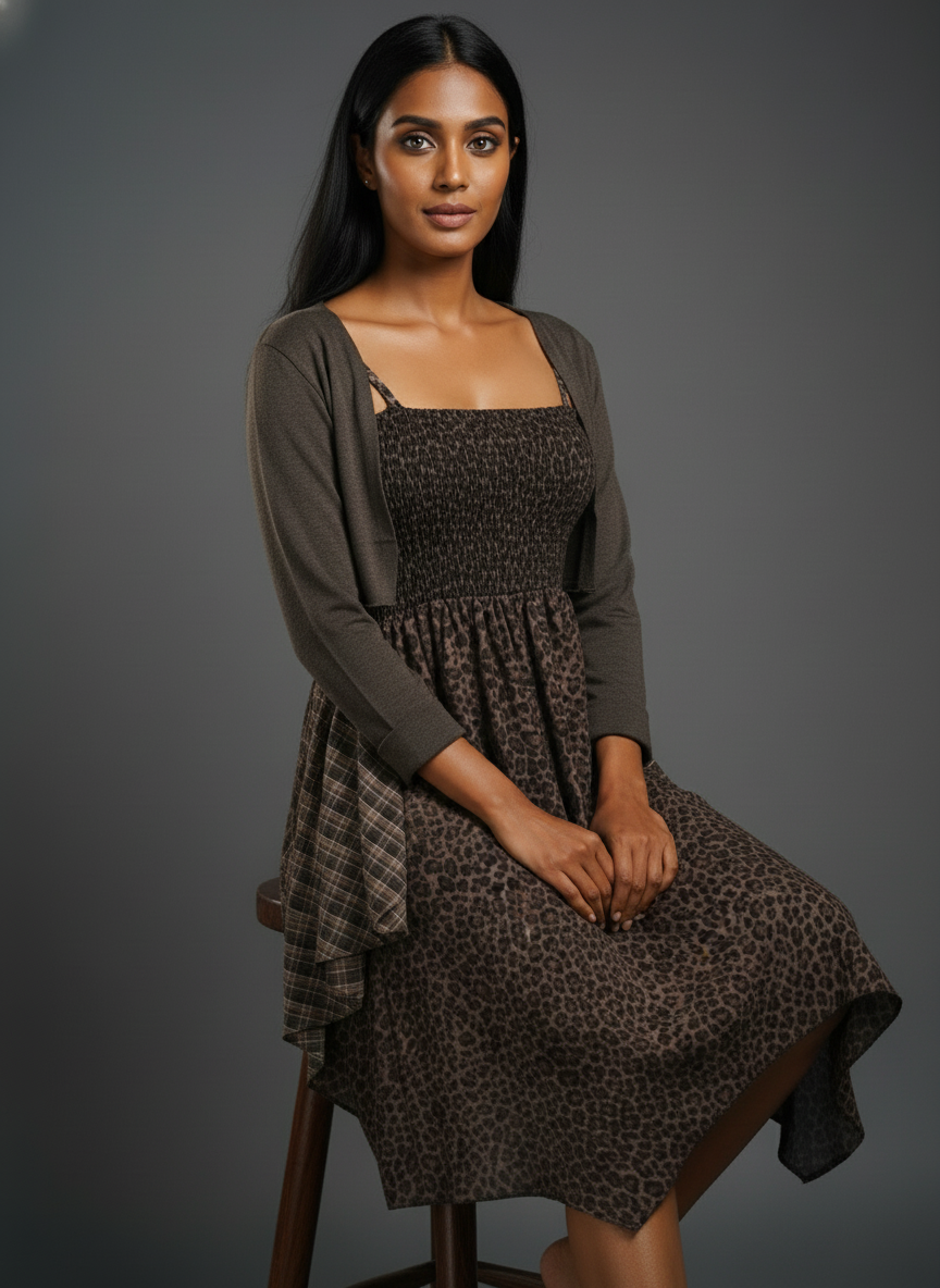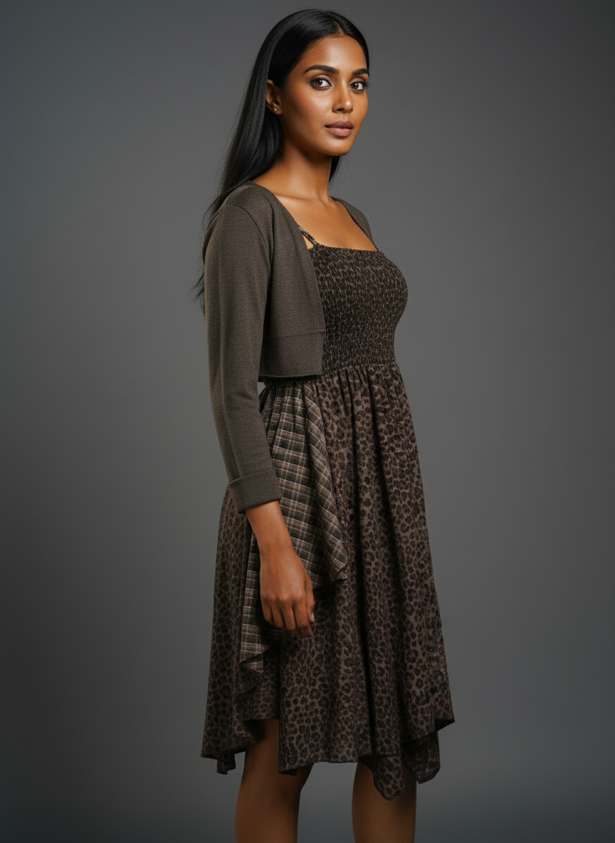 Bold contrast, layered texture—this Mixed-Pattern Boho Set is a visual statement in motion. The strapless smocked dress combines leopard print with plaid panels, flowing into an asymmetrical skirt with lace underlayers. A cropped dark brown shrug adds structure and warmth. Designed for expressive styling and boutique edge, this set is perfect for artful wardrobes and slow fashion showcases Overview: • A two-piece set blending animal print, plaid, and lace textures, ideal for bold, artistic styling. • Fabric/Material: • Dress: Smocked cotton-blend with mixed print panels • Shrug: Lightweight knit • Skirt: Cotton with lace underlayer • Design Details: • Top: Strapless smocked bodice • Shrug: Cropped, long-sleeved, open front • Skirt: Asymmetrical hem with leopard print center and plaid side panels; lace underlayer • Colour: Brown & Beige (leopard), Black & Tan (plaid), Dark Brown (shrug) • Available Sizes: FREE SIZE S to L • Fit: Fitted bodice, relaxed skirt; true to size • Care Instructions: Dry clean recommended or gentle cold wash; hang dry; do not bleach • Closure Type: Pull-on (dress); open front (shrug) • Occasion: Art Events, Boutique Styling, Resort, Lounge