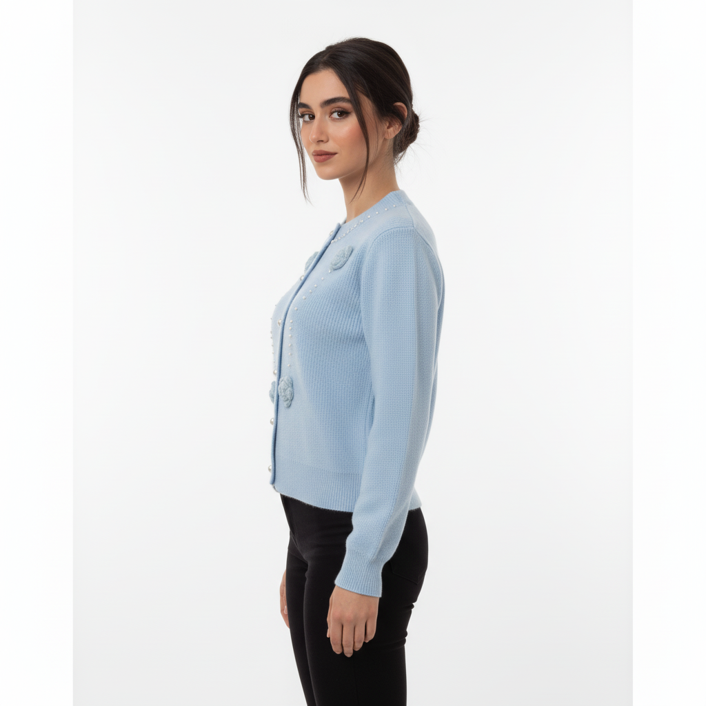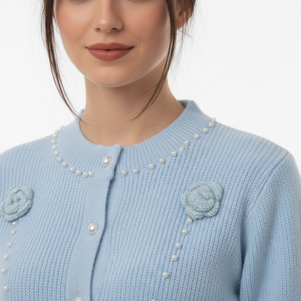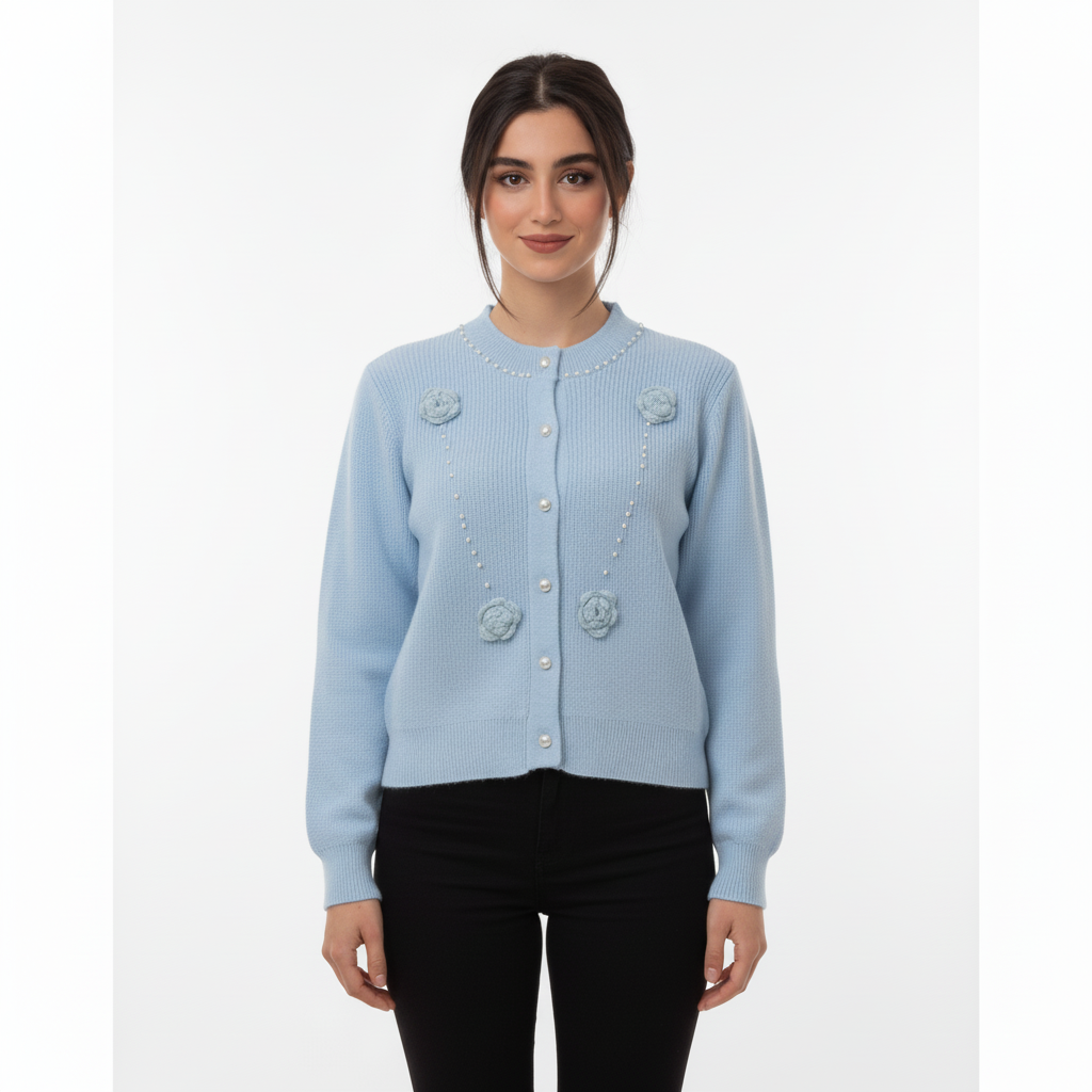 Soft hues meet delicate detailing in this light blue knit cardigan—a graceful blend of comfort and charm. Designed to elevate your everyday wardrobe, this piece features hand-finished embellishments that add a touch of artisanal elegance. ✨ Product Highlights: • Gentle Knit Fabric: Lightweight and breathable for all-season layering. • Pearl-Like Button Closure: Classic front fastening with a refined finish. • Crocheted Floral Appliqués: Three flowers on each side add texture and visual interest. • Curved Beadwork: Elegant arcs of small beads connect the florals, creating a flowing, symmetrical design. • Beaded Neckline: A subtle shimmer frames the collar for a polished look. • Ribbed Edges: Cuffs and hem provide structure and a tailored silhouette. 🎯 Style Inspiration: Wear it over a white camisole and high-waisted jeans for a casual-chic vibe, or layer with a midi skirt and heels for a soft, romantic ensemble. 📏 Fit & Sizing: Relaxed fit. True to size. Model is 5'6" and wears size S. Refer to our size chart for guidance.