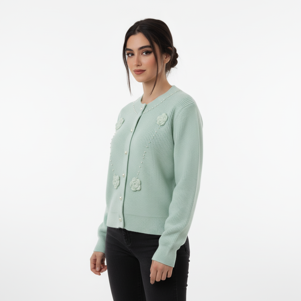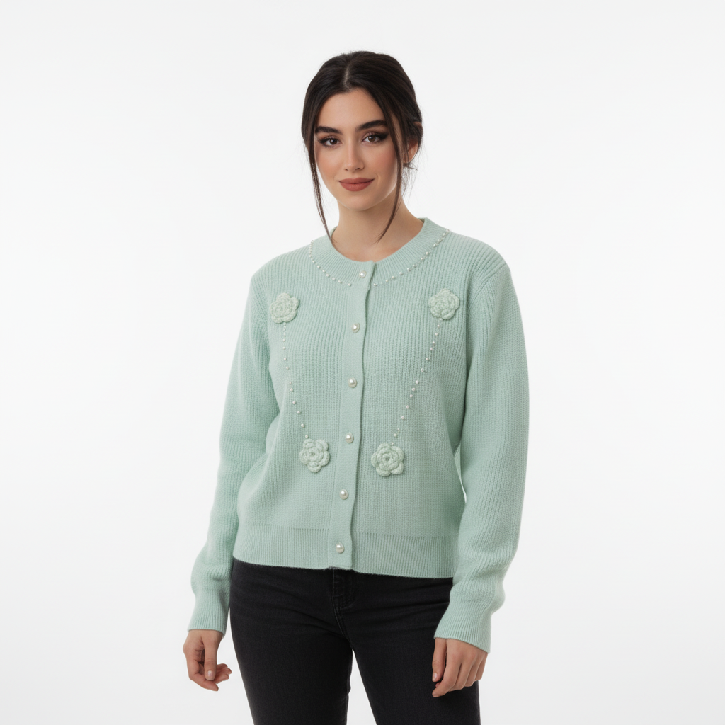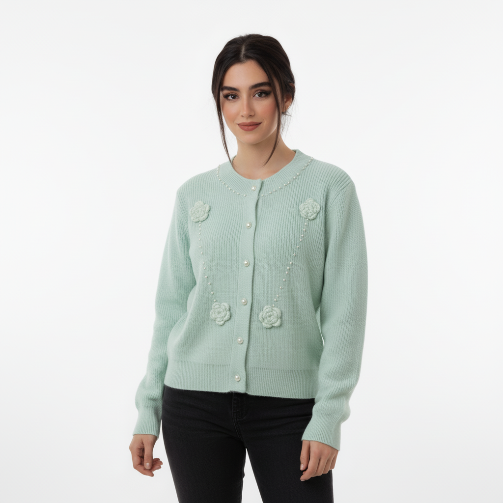 Soft, serene, and delicately detailed—this light green knit sweater is a celebration of subtle elegance. Designed to bring a touch of handcrafted charm to your wardrobe, it’s perfect for layering through the seasons while making a graceful statement. ✨ Product Highlights: • Premium Knit Fabric: Lightweight and breathable with a gentle stretch for everyday comfort. • Pearl-Like Button Closure: Classic front fastening with a refined, vintage-inspired finish. • Crocheted Floral Appliqués: Symmetrically placed flowers add texture and artisanal appeal. • Beaded Accents: A line of pearls along the neckline and floral detailing create a soft shimmer. • Ribbed Cuffs & Hem: Ensures a structured fit while maintaining a relaxed silhouette. 🎯 Style Tip: Pair it with wide-leg trousers and loafers for a polished daytime look, or layer over a slip dress for a romantic evening vibe. 📏 Fit & Sizing: Relaxed fit. True to size. Model is 5'6" and wears size S. Check our size chart for the perfect fit.