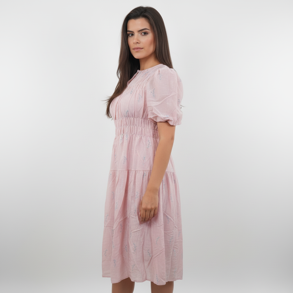 Soft blush tones meet delicate texture in this Light Pink Embroidered Puff-Sleeve Dress—crafted for comfort with a romantic edge. Featuring a ruched bodice, gathered waist, and flared skirt, it’s finished with subtle white floral embroidery and a round neckline with a center notch. Perfect for daytime styling, creative workspaces, or slow weekends. Overview: • A knee-length dress with ruched bodice and subtle embroidery, ideal for casual elegance. • Fabric/Material: • Lightweight cotton-blend with crinkled texture • Lining: Unlined for breathable wear • Design Details: • Round neckline with center notch • Short puff sleeves with elastic cuffs • Ruched bodice and gathered waist • Flared skirt with knee-length silhouette • White floral embroidery throughout • Vertical pleats on bodice • Colour: Light Pink with White Embroidery • Available Sizes: FREE SIZE S to L • Fit: Fitted bodice, relaxed skirt; true to size • Care Instructions: Gentle cold wash or dry clean; hang dry; do not bleach • Closure Type: Zipper at back • Occasion: Daywear, Brunch, Resort, Lounge