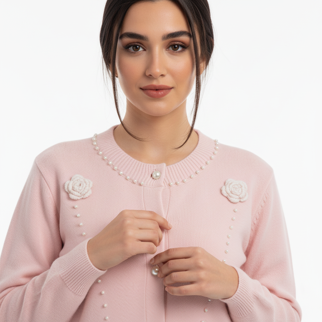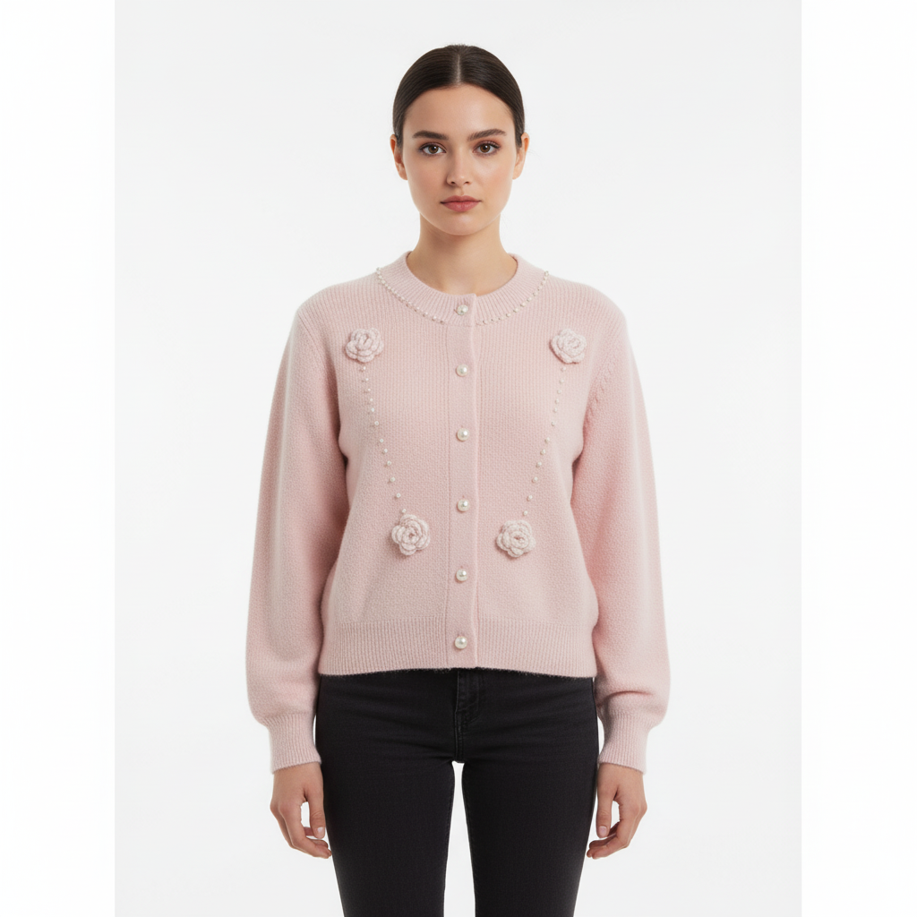 Soft, feminine, and intricately detailed—this light pink knit sweater is a delicate blend of comfort and charm. With handcrafted floral accents and pearl embellishments, it’s designed to add a graceful touch to your everyday wardrobe. ✨ Product Highlights: • Gentle Knit Fabric: Lightweight and breathable for year-round wear. • Pearl-Like Button Closure: Classic front fastening with a refined finish. • Knitted Floral Appliqués: Symmetrical white flowers add texture and artisanal appeal. • Beaded Detailing: Curved strings of pearls create a flowing, elegant design across the front. • Beaded Neckline: A subtle shimmer frames the collar for a polished look. • Ribbed Cuffs & Hem: Ensures a structured fit while maintaining a relaxed silhouette. 🎯 Style Tip: Pair with neutral trousers or a pleated skirt for a fresh daytime look, or layer over a slip dress for soft evening elegance. 📏 Fit & Sizing: Relaxed fit. True to size. Model is 5'6" and wears size S. Refer to our size chart for the perfect fit.