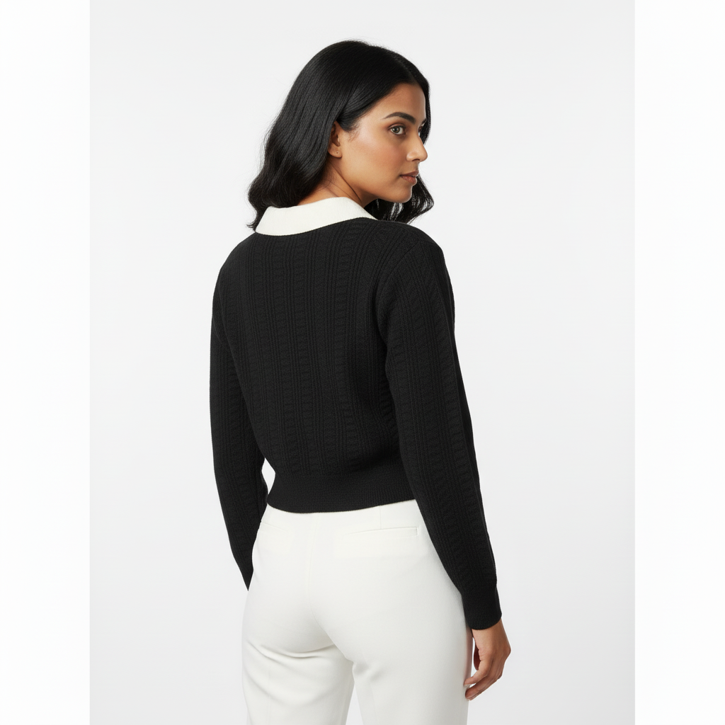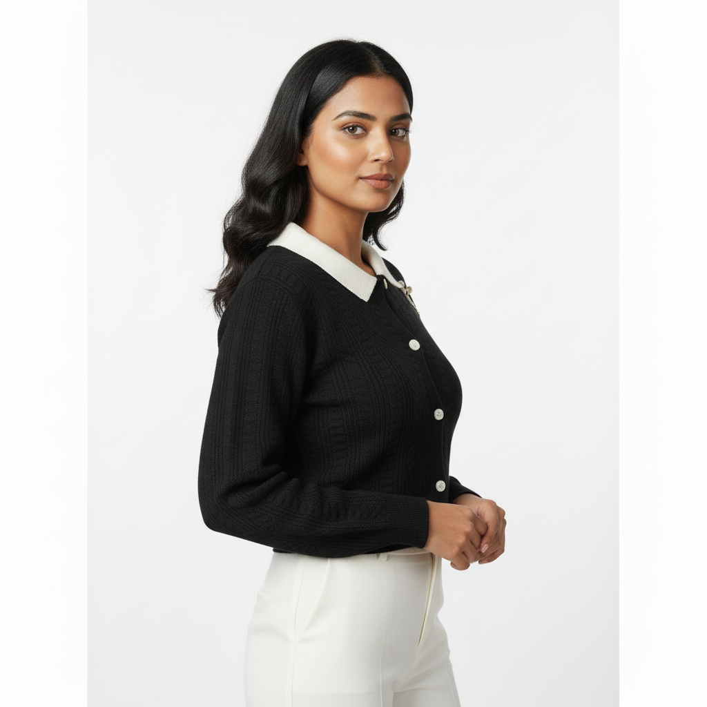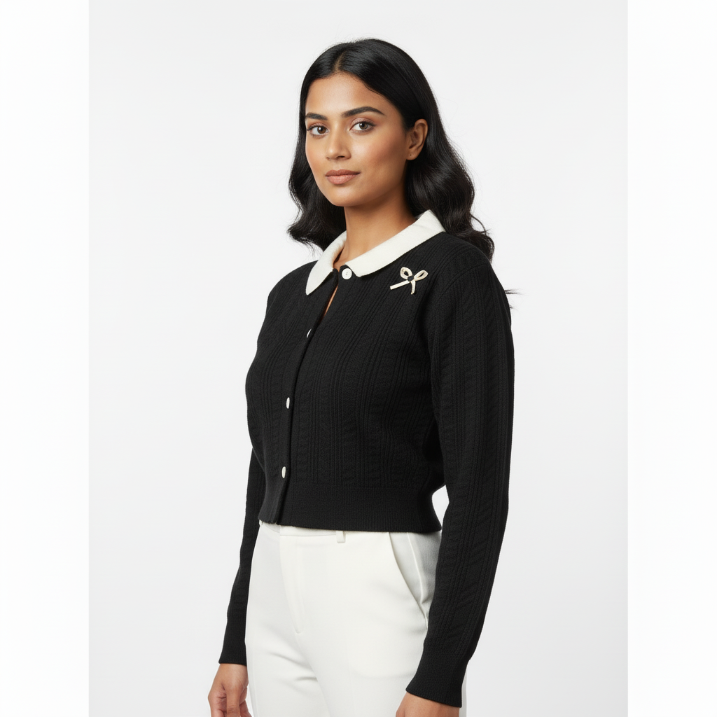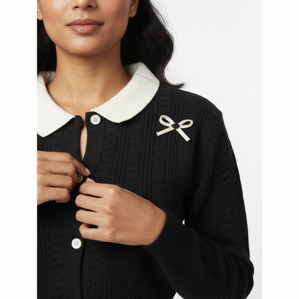 ✨ Product Description Elevate your layering game with the Midnight Chevron Knit Cardigan, a bold yet refined piece that blends texture, contrast, and charm. Crafted in deep black knit with vertical and chevron ribbing, this cardigan features a crisp white collar and a soft beige bow brooch for a touch of vintage elegance. The four-button front and structured silhouette make it perfect for transitional weather, while the monochrome palette ensures easy styling with streetwear staples or elevated basics. 📌 Key Features • Material: Premium acrylic blend with chevron ribbed texture • Design: White contrast collar + beige bow brooch with black tag • Closure: 4-button front with white buttons • Colour: Jet black with white and beige accents • Fit: Slim cropped silhouette • Style tip: Pair with high-waisted trousers or layer over a slip dress for a monochrome moment 📏 Size & Fit Model is 5'6" and wears size M.