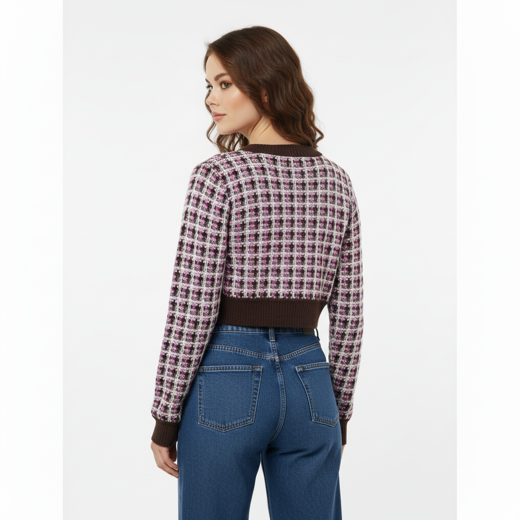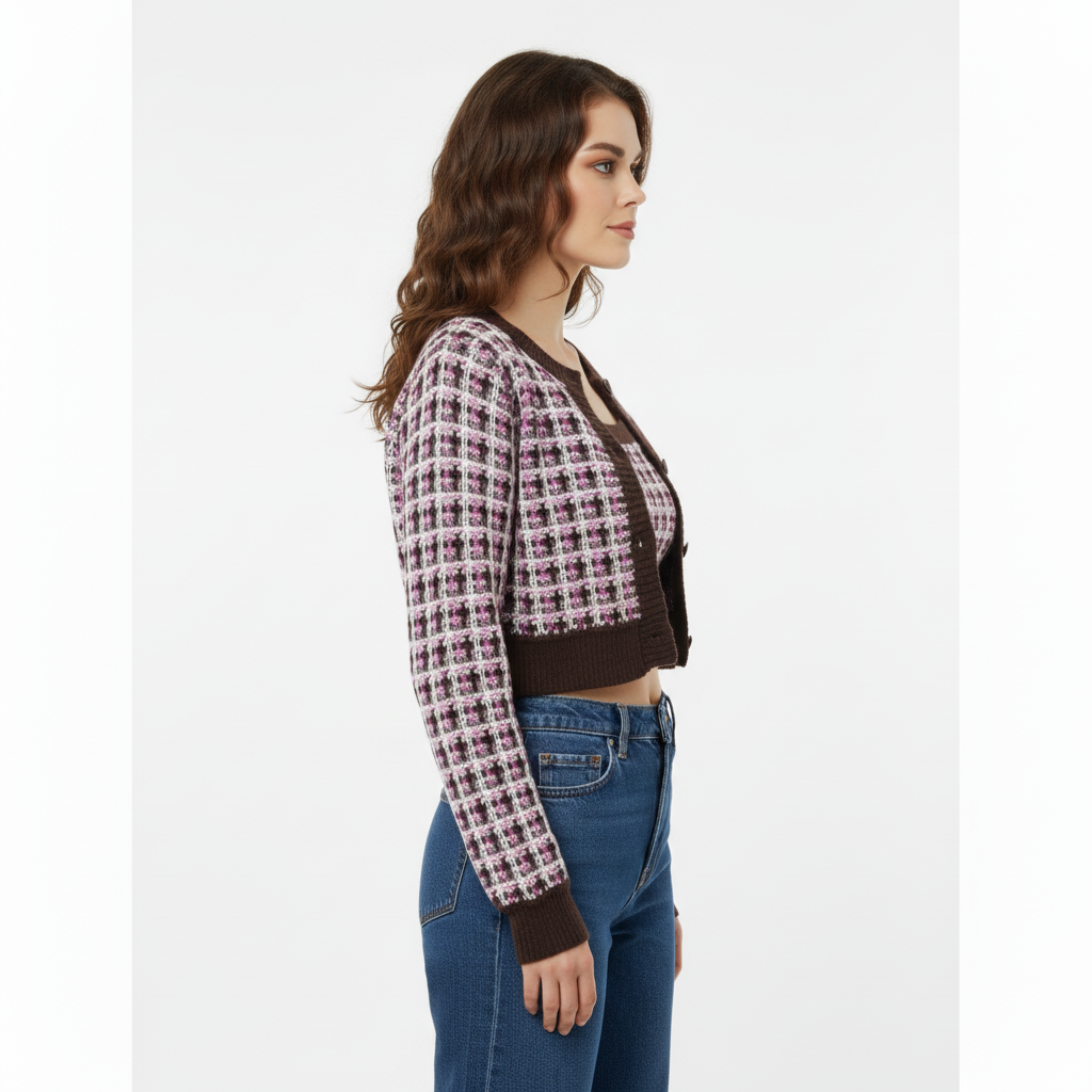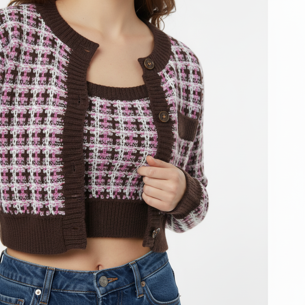 ✨ Product Description Retro texture meets modern silhouette in the Mocha Grid Knit Co-Ord. This two-piece set features a cropped cardigan and matching tank, both crafted in a rich checkered knit of mocha brown, blush pink, and ivory white. The cardigan includes a ribbed neckline, hem, and cuffs, three-button closure, and a small chest pocket for added detail. The matching tank mirrors the pattern and trim for a cohesive layered look. Perfect for transitional weather or statement layering, this set blends warmth, structure, and visual impact — ideal for pairing with cargos, pleated skirts, or tonal trousers 📌 Key Features • Two-piece set: Cropped cardigan + matching tank • Material: Structured acrylic blend with soft stretch • Design: Multi-color checkered knit, ribbed edges, chest pocket, buttoned front • ColoUr: Mocha brown, blush pink, ivory white • Fit: Slim cropped silhouette • Style tip: Pair with neutral bottoms or layer under a trench for a bold streetwear twist 📏 Size & Fit Model is 5'6" and wears size M.