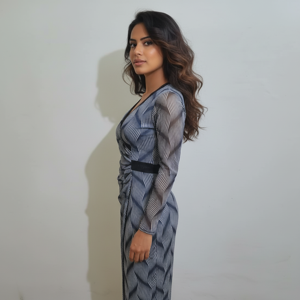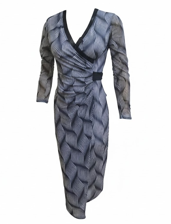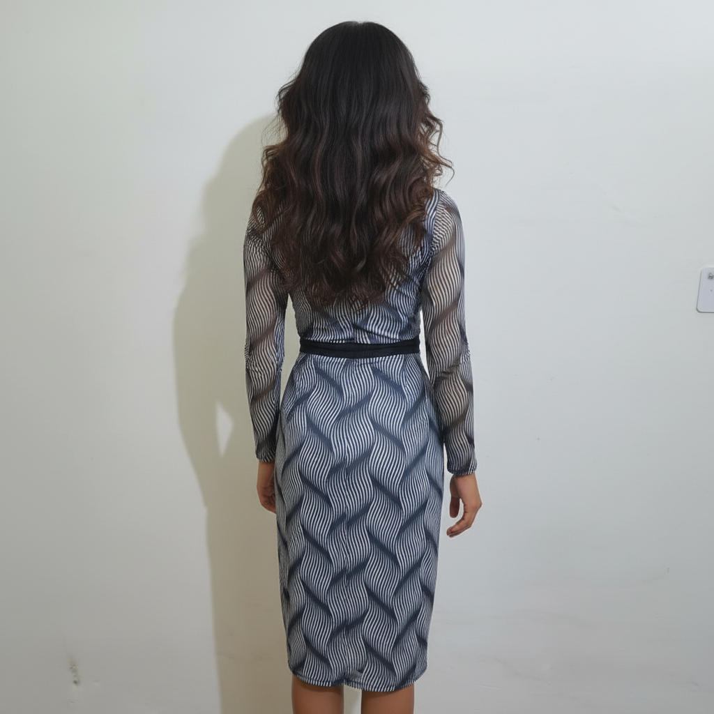 📝 Overview: Elevate your wardrobe with this monochrome masterpiece. Featuring a bold black and white wave pattern, this bodycon dress blends sheer elegance with sculpted design. The wrap-style V-neckline, ruched waist, and mid-calf length create a flattering silhouette perfect for evening wear, gallery nights, or upscale street style. 🧵 Fabric/Material: Outer: Sheer stretch mesh with geometric wave print Lining: Soft stretch jersey (partial) ✨ Design Details: V-neckline with contrast black trim Long sheer sleeves Wrap-style bodice with ruched waist Mid-calf length hemline Fitted silhouette with moderate stretch Black accent belt included 🎨 Color: Black & White Wave Print 📏 Available Sizes: FREE SIZE (S to L) 📐 Fit: Bodycon, true to size 🧼 Care Instructions: Hand wash cold or dry clean; do not bleach 🚪 Closure Type: Pullover 🎯 Occasion: Evening, Art Events, Streetwear, Date Night 👗 Model Info: Model is 5’6” wearing size M ➕ Additional Info: Stretch Level: Moderate Lining: Partial Belt: Included