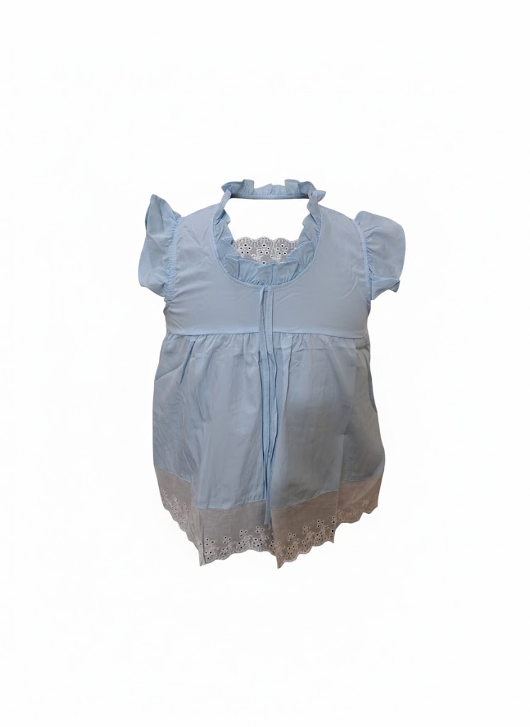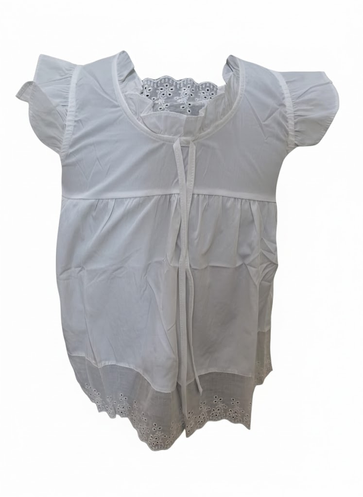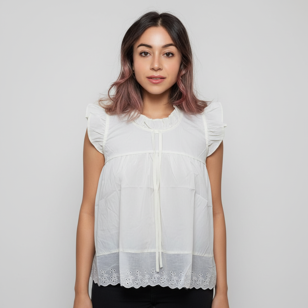 Soft, gathered, and poetically detailed—the WillowWhim Eyelet Blouse is a gentle nod to pastoral charm. With its ruffled sleeves, floral eyelet lace, and airy silhouette, it’s designed to evoke a sense of ease and grace. Ideal for sun-drenched afternoons, creative escapes, or slow weekend moments. • Overview: • A sleeveless blouse with ruffled cap sleeves, gathered bodice, and eyelet lace accents for a soft, cottagecore-inspired look. • Fabric/Material: • Outer: Lightweight semi-sheer cotton with embroidered eyelet lace trim • Lining: Unlined for breathable wear • Design Details: • Top: Round neckline with center tie, ruffled cap sleeves, gathered bodice for volume • Back: High ruffled neckline with gathered yoke and puffed sleeves, lace-trimmed hem • Colour: Pastel Mint with White Eyelet Lace Accents • Available Sizes: FREE SIZE S to XL • Fit: Relaxed silhouette with soft drape; true to size • Care Instructions: Gentle cold wash or dry clean; steam lightly; do not bleach • Closure Type: Pullover style • Occasion: Daywear, Brunch, Studio Time, Cultural Gatherings • Additional Information: • Stretch level: None • Lining: None