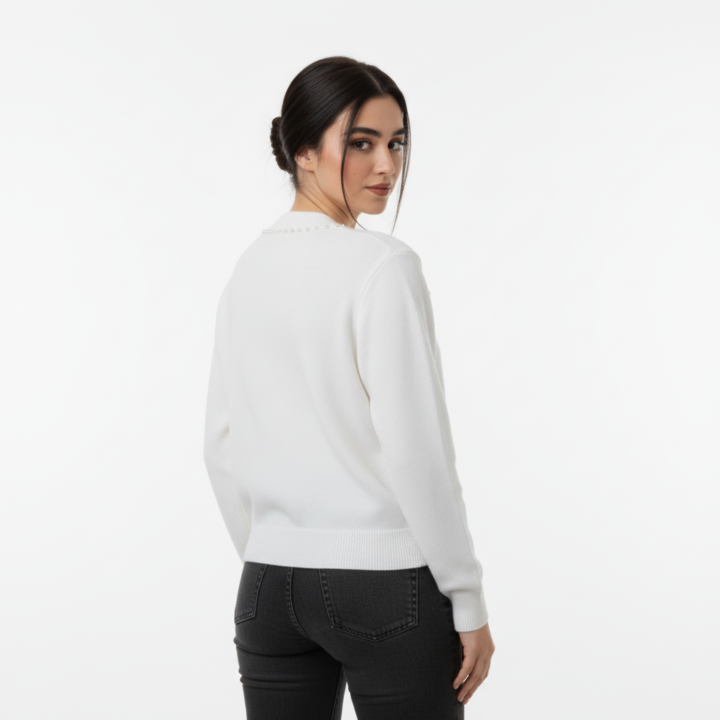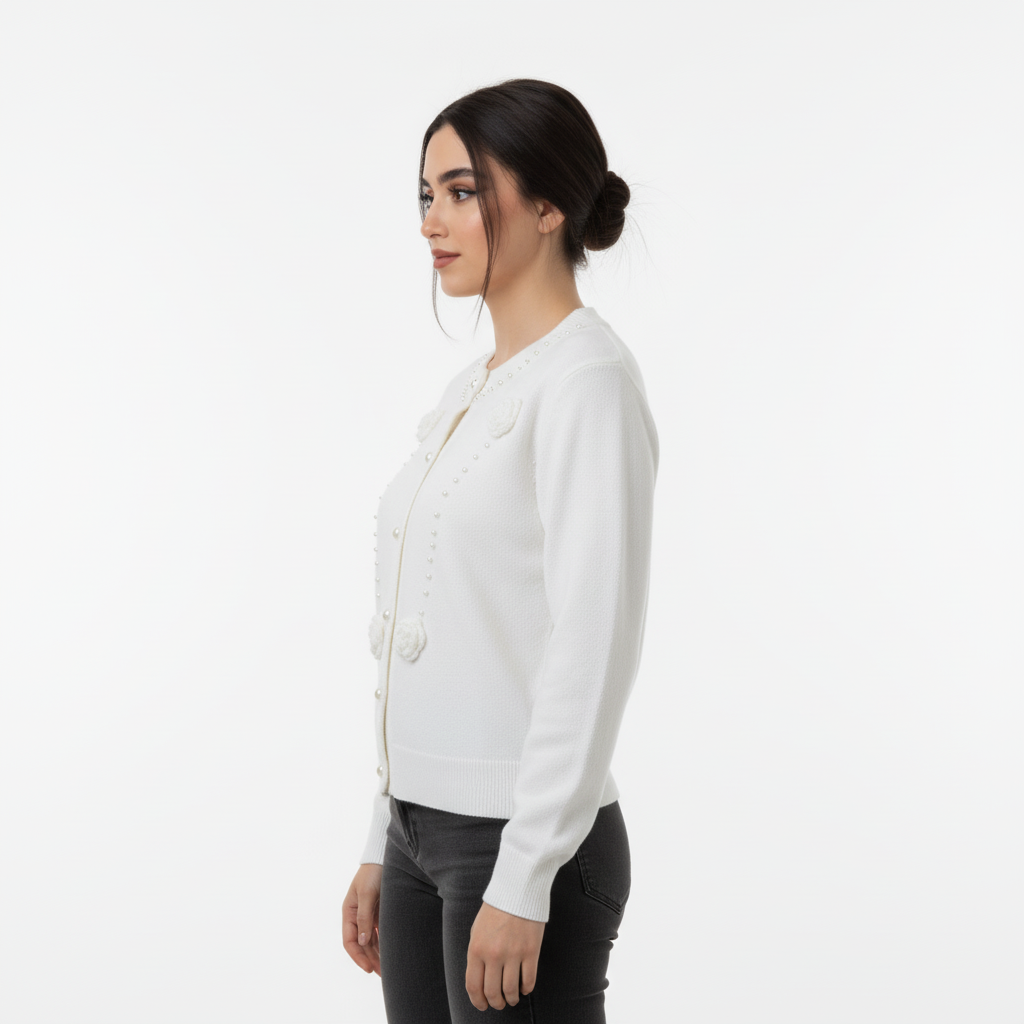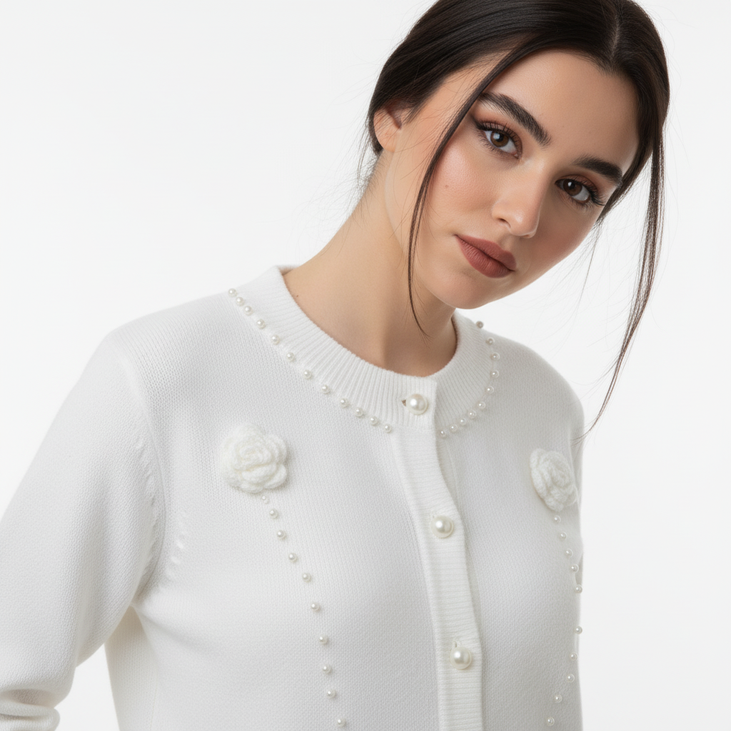 Elevate your layering game with this elegant white knit cardigan, where delicate craftsmanship meets timeless charm. Designed for those who appreciate subtle luxury, this piece blends soft textures with intricate detailing to create a standout wardrobe essential. ✨ Features: • Premium Knit Fabric: Soft, breathable, and cozy for all-day comfort. • Pearl Button Closure: Adds a touch of vintage sophistication. • Floral Appliqué & Beaded Embellishments: Hand-placed accents cascade from shoulder to chest, creating a graceful vertical flow. • Beaded Neckline: Subtle shimmer around the collar for an elevated finish. • Ribbed Cuffs & Hem: Ensures a snug fit while maintaining structure. • Versatile Fit: Designed to flatter across sizes with a relaxed silhouette. 🎯 Styling Tip: Pair it with high-waisted trousers or a pleated skirt for a refined daytime look, or layer over a slip dress for evening elegance. 📏 Size & Fit: Model is 5'6" and wears size S. Fits true to size. Refer to our size chart for the perfect fit.