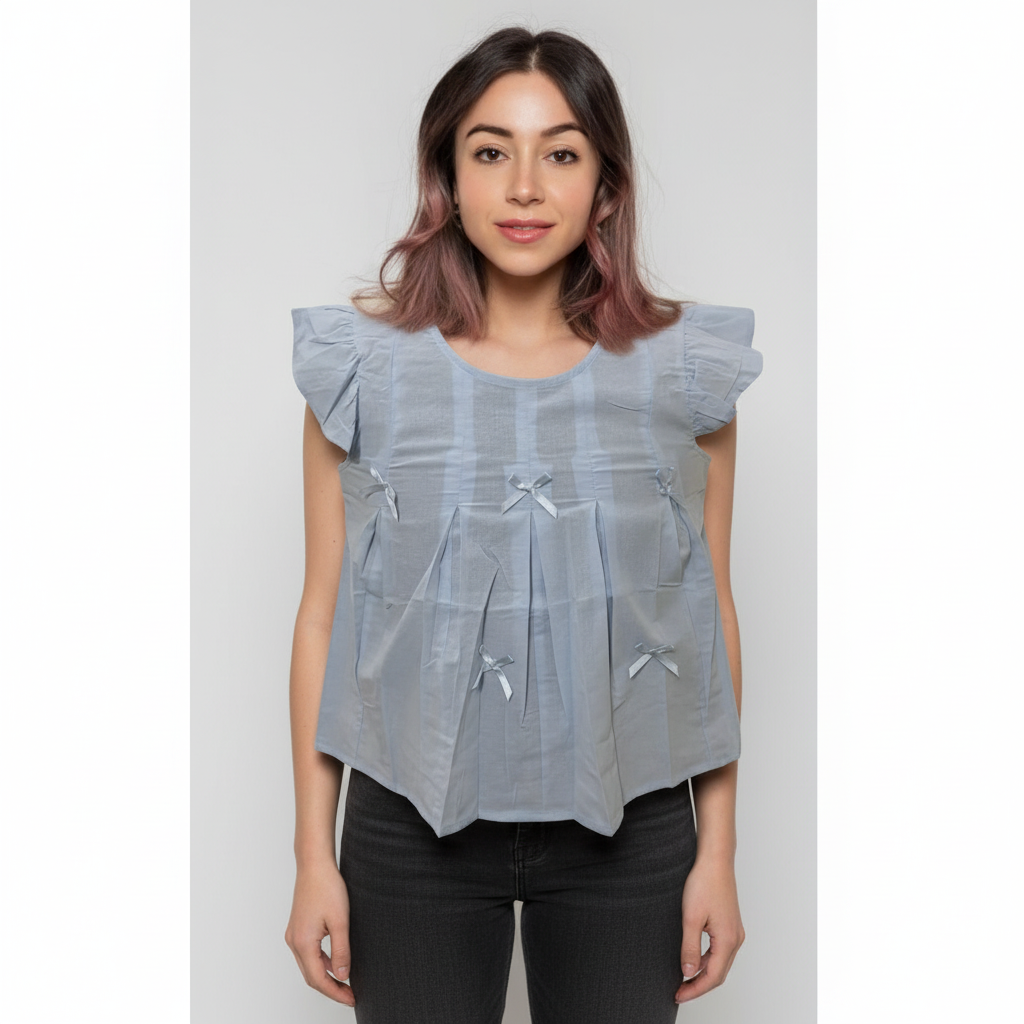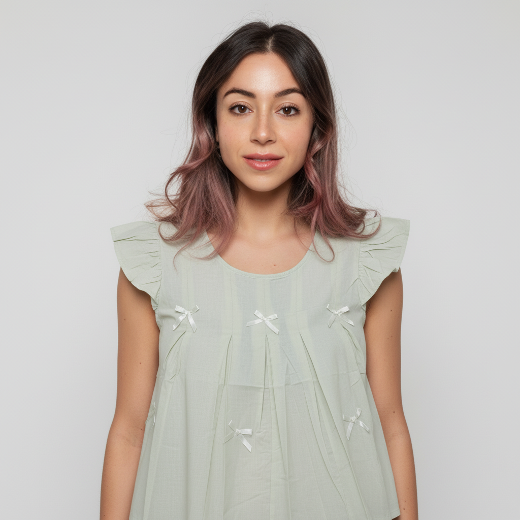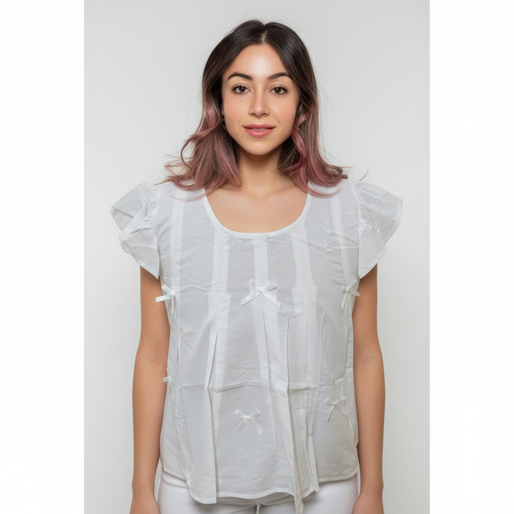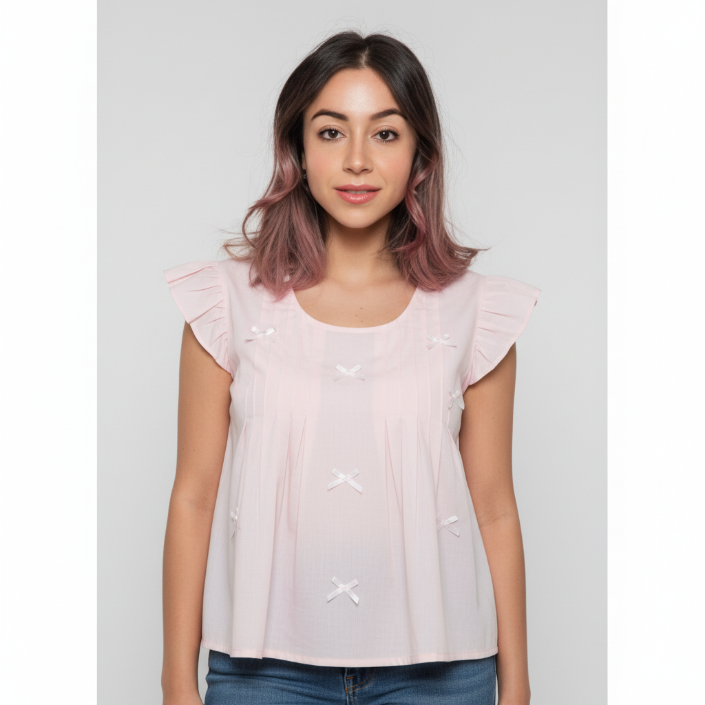 🌸 Product Description Sweet, ruffled, and playfully poised—the BowPetal Pleated Blouse brings a touch of vintage charm to modern femininity. Crafted from soft voile with delicate pleats and dainty ribbon bows, it’s a dreamy piece that pairs effortlessly with denim, skirts, or layered looks. Perfect for brunch dates, gallery strolls, or slow Sundays in style. • Overview: • A semi-sheer pleated blouse with layered ruffle sleeves and bow accents, designed for whimsical, feminine styling. • Fabric/Material: • Outer: Lightweight cotton voile with soft texture • Lining: Unlined for airy, breathable wear • Design Details: • Front: Vertical pleats with five matching pink ribbon bows, round neckline, short ruffled sleeves • Back: Clean finish with soft drape and subtle sheerness • Colour: Light Pink with Matching Ribbon Accents • Available Sizes: FREE SIZE S to L • Fit: Relaxed fit with gentle structure; true to size • Care Instructions: Gentle cold wash or dry clean; steam lightly to remove wrinkles; do not bleach • Closure Type: Pullover style • Occasion: Brunch, Daywear, Art Walks, Casual Outings