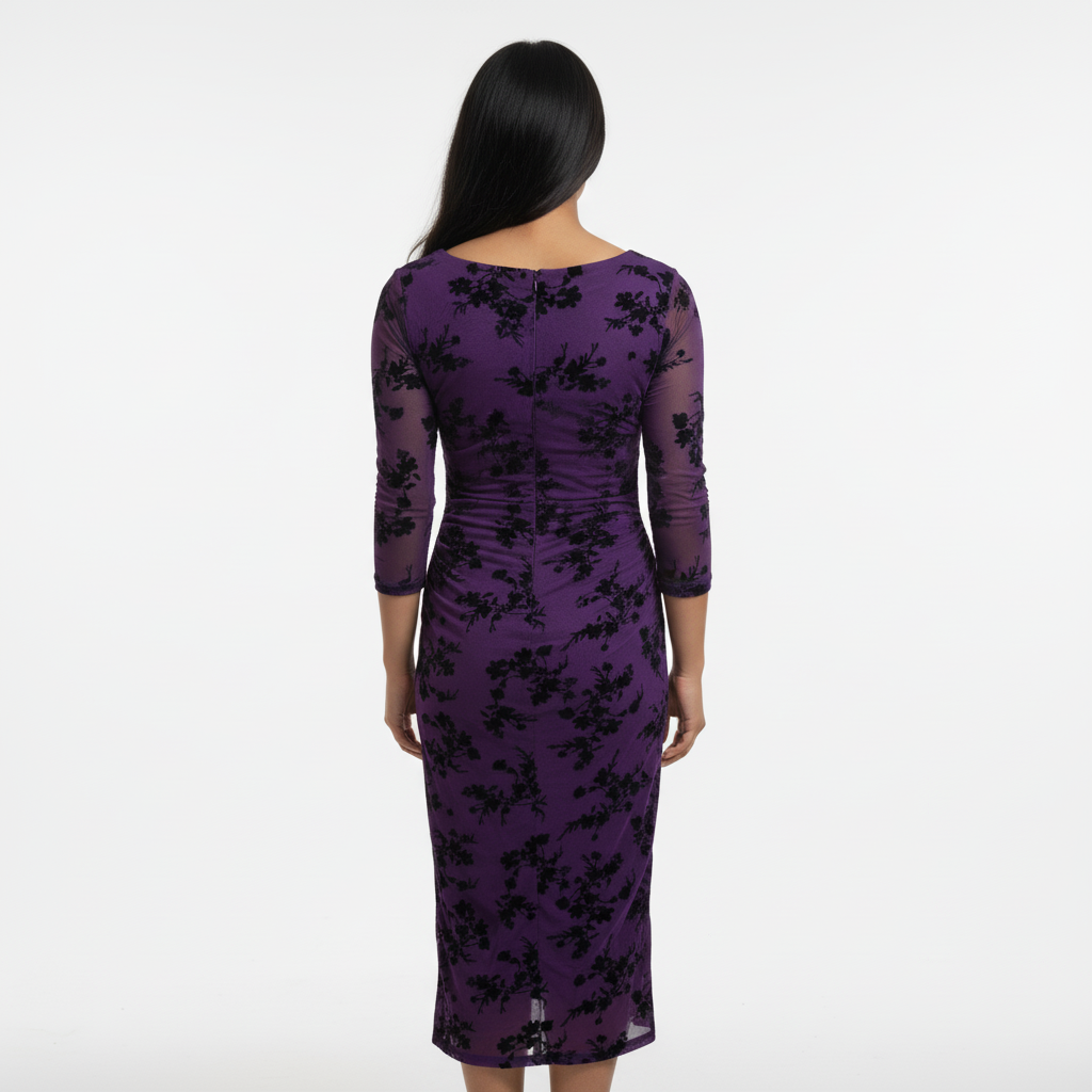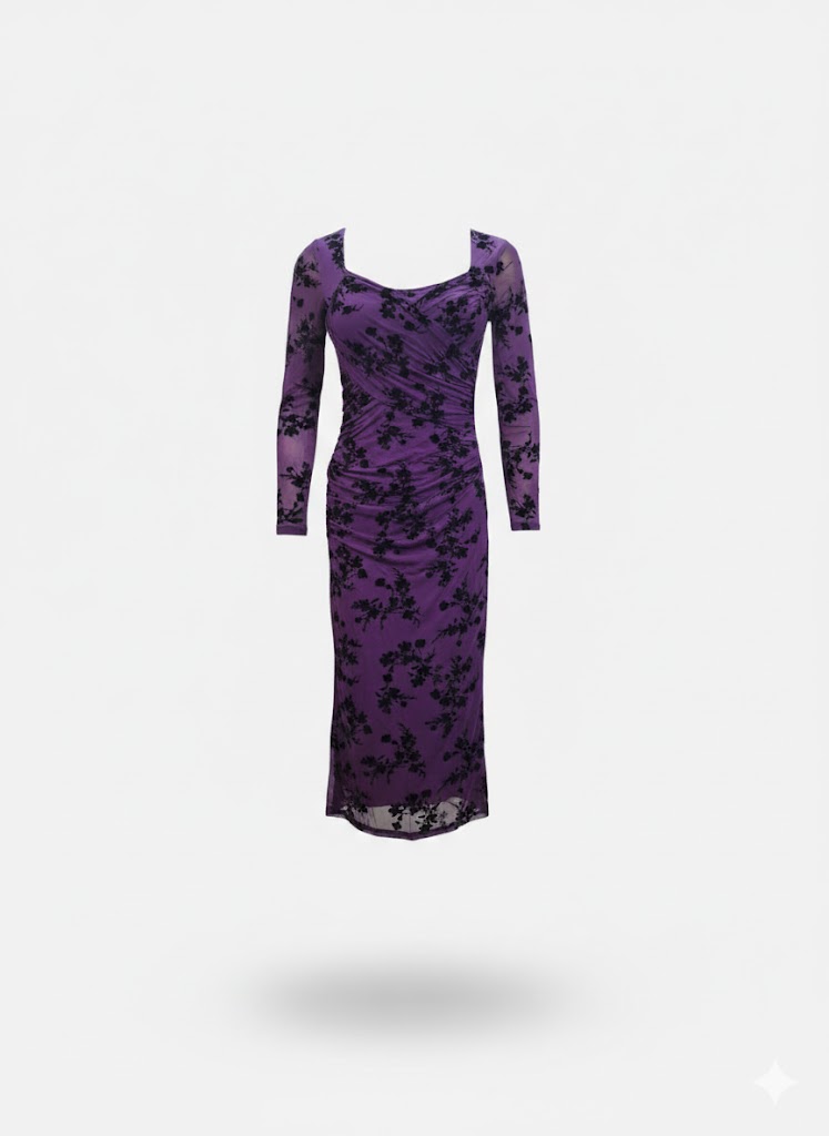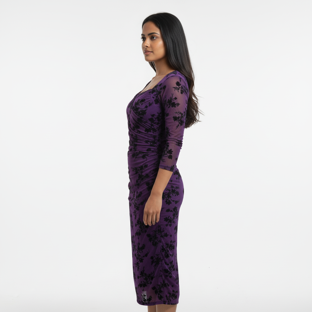 Turn heads in this elegant Purple bodycon dress, adorned with black floral velvet appliqué. Designed for sophistication and comfort, this dress features a figure-flattering ruched silhouette, sheer long sleeves, and a modern square neckline—perfect for evening gatherings, special occasions, or a night out." Key Product Information • Overview: • A chic, figure-hugging dress with black floral velvet detailing on a deep Purple base, ideal for parties, dinners, and formal events. • Fabric/Material: • Outer: Stretch mesh with velvet appliqué • Lining: Soft knitted fabric • Design Details: • Square neckline • Sheer long sleeves • Ruched side seams for a flattering fit • Midi length (below knee) • Colour: Purple with Black Floral Velvet • Available Sizes: FREE SIZE S to L • Fit: Bodycon, true to size • Care Instructions: Hand wash cold or dry clean; do not bleach; • Closure Type: Pullover • Occasion: Evening, Party, Cocktail, Date Night • Model Information: Model is 5’6” wearing size M • Additional Information: • Stretch level: Moderate • Lining: Partial