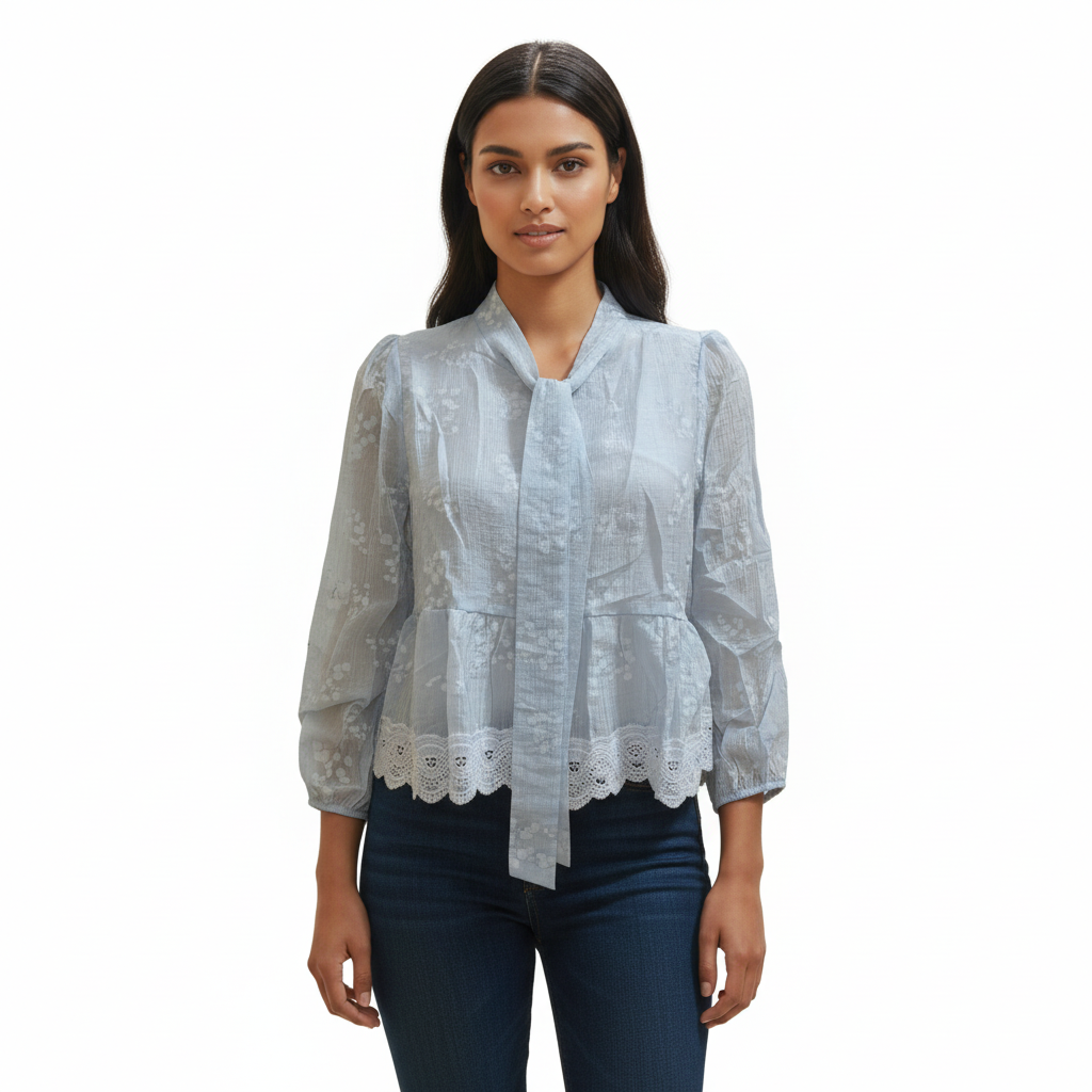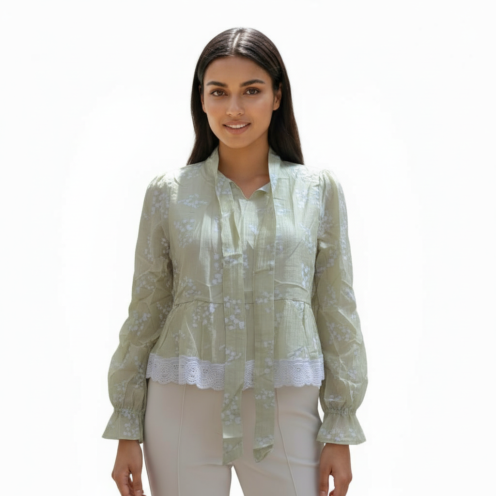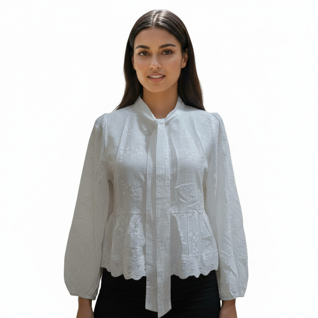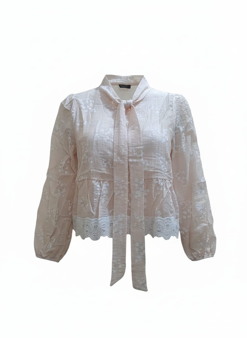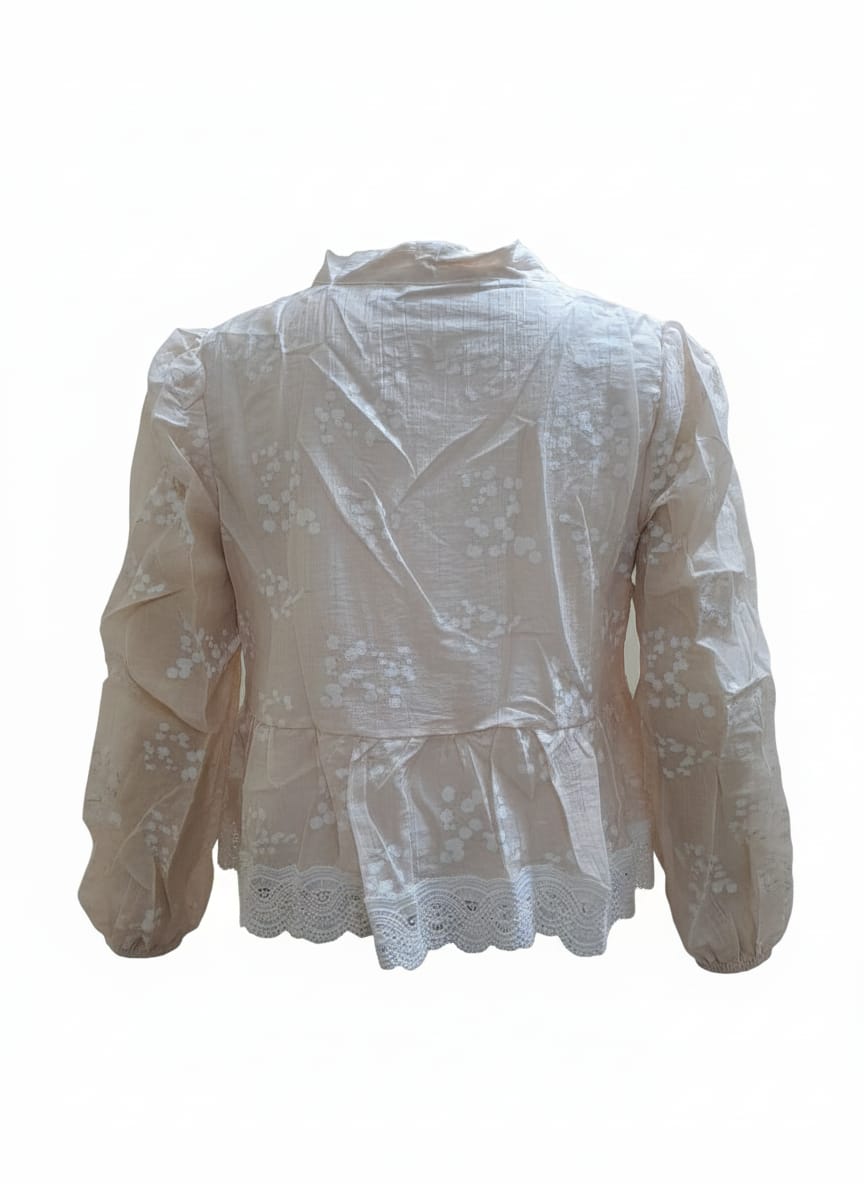 🌸 Product Description Soft, layered, and delicately detailed—the RoseLace Layered Blouse is a romantic take on everyday elegance. Crafted from crinkled voile with scattered white floral motifs, it features a visible inner layer and a wide lace-trimmed hem that adds movement and charm. Ideal for festive mornings, cultural gatherings, or slow weekends with style • Overview: • A semi-sheer floral blouse with layered hem and lace detailing, designed for soft, feminine styling. • Fabric/Material: • Outer: Lightweight crinkled cotton voile with floral embroidery • Lining: Visible inner white layer (partial) • Design Details: • Top: Long sleeves, gathered cuffs, scattered white floral embroidery, lace-trimmed hem, layered construction • Back: Matching embroidery with gathered waist and ruffled finish • Colour: Blush Pink with White Floral Embroidery & Lace • Available Sizes: FREE SIZE S to XL • Fit: Relaxed, slightly flared silhouette; true to size • Care Instructions: Gentle cold wash or dry clean; hang dry; do not bleach • Closure Type: Pullover style • Occasion: Festive Daywear, Brunch, Cultural Events, Casual Gatherings