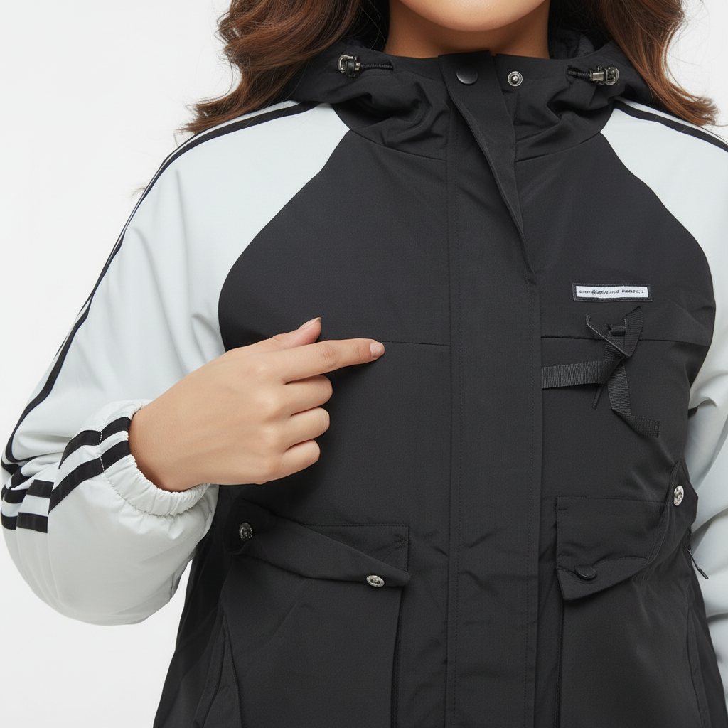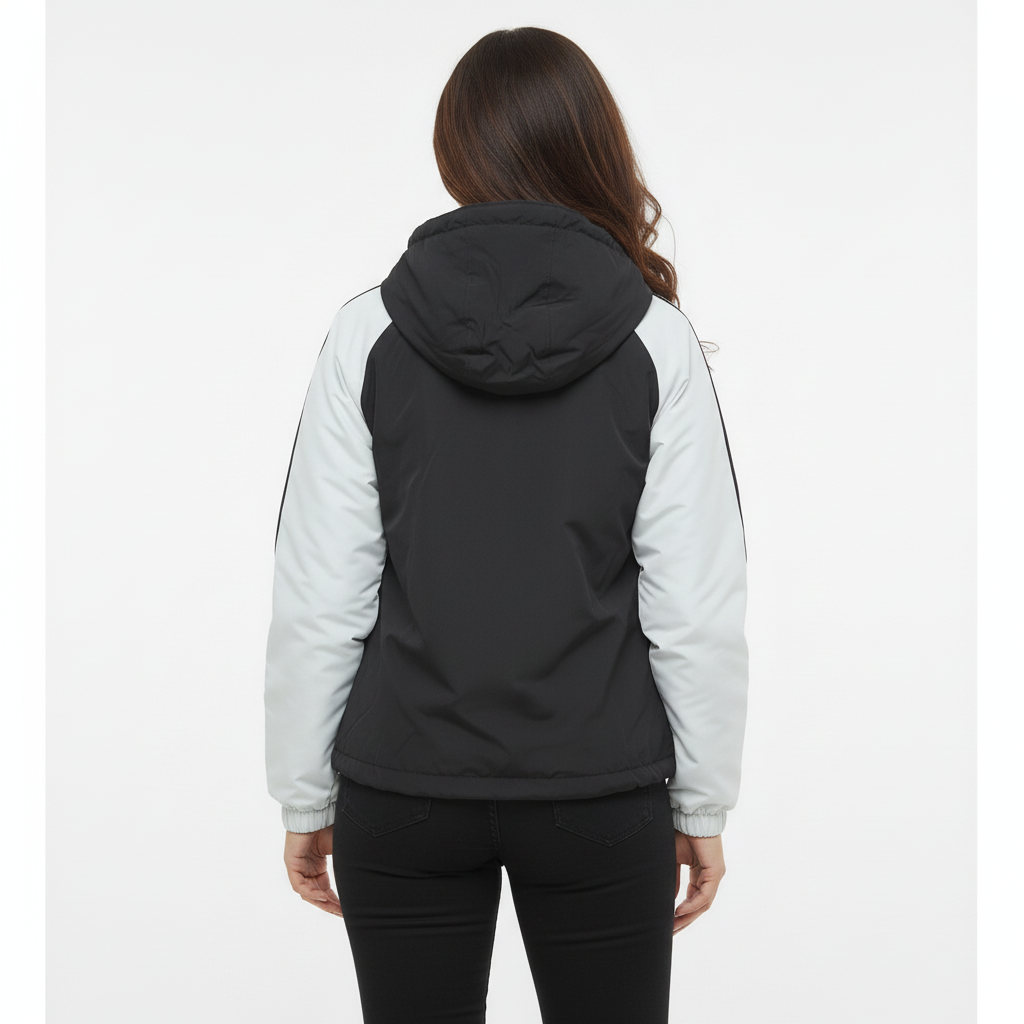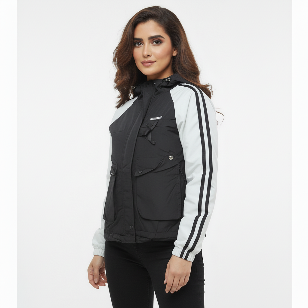 Urban-ready. Weather-proof. Statement piece. The ZAKH Shadowline Hooded Utility Jacket blends streetwear aesthetics with tactical functionality. Designed for those who move with purpose, this monochrome masterpiece features a bold contrast of black and white with athletic sleeve stripes that nod to vintage varsity style. 🔍 Key Features • Colour way: Jet Black body with White sleeves and Black stripe detailing • Material: Durable, mid-weight poly-cotton blend for year-round wear • Closure: Full-length front zipper with storm flap protection • Pockets: o Two oversized flap pockets with snap buttons for secure storage o One vertical zippered chest pocket for essentials • Hood: Adjustable drawstring hood for added coverage • Fit: Relaxed silhouette with structured shoulders