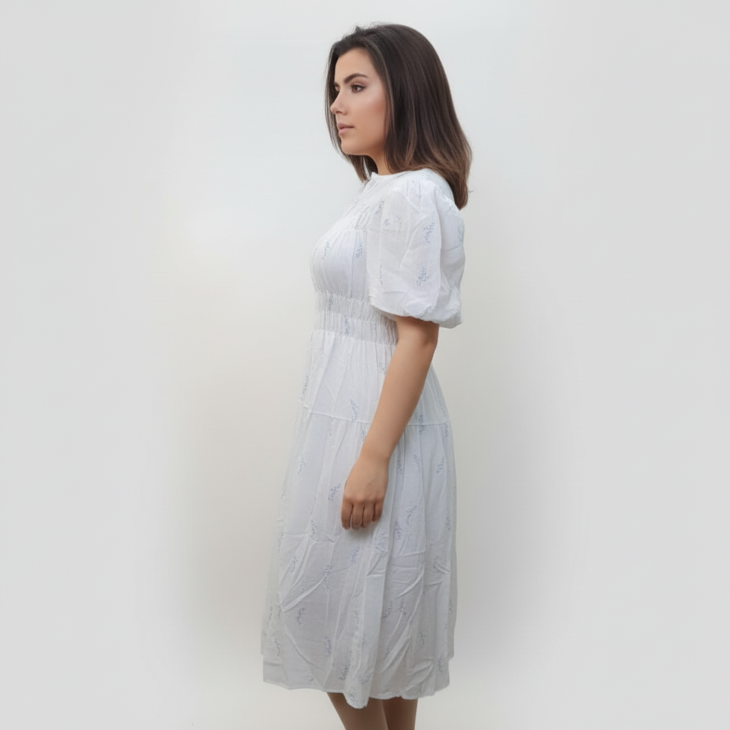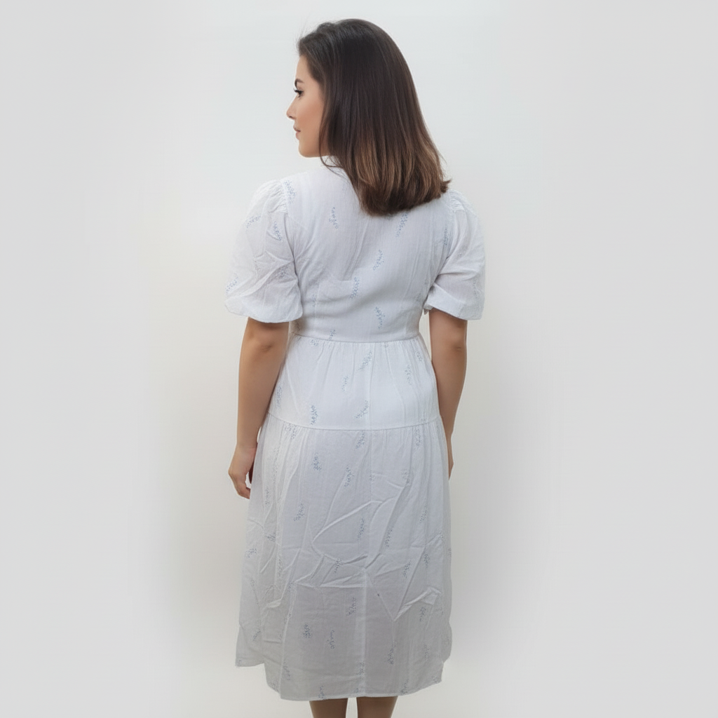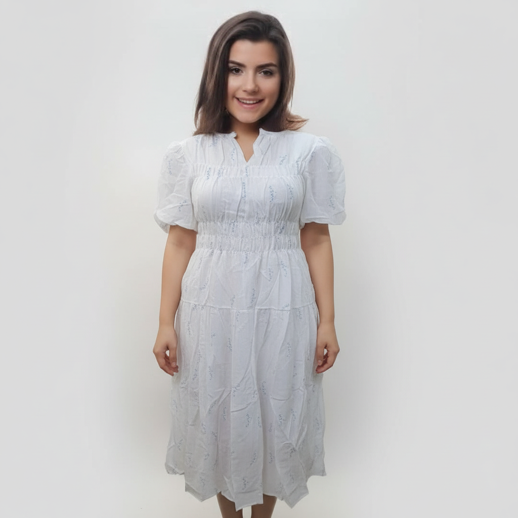 Delicate texture meets timeless charm in this White Embroidered Puff-Sleeve Dress. Featuring a pleated bodice, soft puff sleeves, and scattered blue floral embroidery, this piece blends structure with softness. The modest neckline and flared skirt make it perfect for daytime elegance, creative workspaces, or slow weekends. Overview: • A knee-length dress with pleated bodice and subtle floral embroidery, ideal for casual refinement. • Fabric/Material: • Outer: Lightweight cotton-blend with crinkled texture • Lining: Unlined for breathable wear • Design Details: • Round neckline with center slit • Short puff sleeves with elastic cuffs • Vertical pleats on bodice • Gathered waist with flared skirt • Knee-length silhouette • Subtle blue floral embroidery throughout • Colour: White with Blue Embroidery • Available Sizes: FREE SIZE S to L • Fit: Fitted bodice, relaxed skirt; true to size • Care Instructions: Gentle cold wash or dry clean; hang dry; do not bleach • Closure Type: Zipper at back • Occasion: Daywear, Brunch, Resort, Lounge